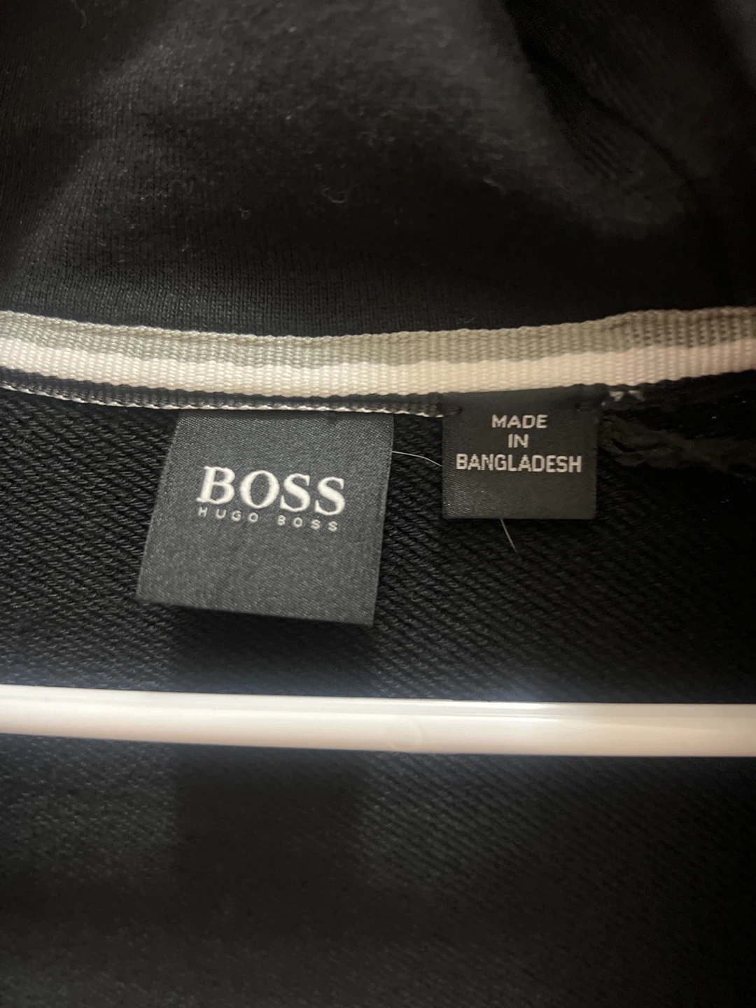 Selling a Hugo Boss black zip-up hoodie. It's in good condition and perfect for layering or wearing on its own. The hoodie features the Hugo Boss logo and has a comfortable fit. It's made in Bangladesh.