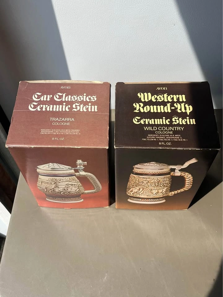 The original 1979 Avon Car Classics & 1980 Western Round-Up Ceramic Steins are vintage, collectible beer steins featuring classic cars and scenes from the Wild West. Each has a hinged lid and comes with the original plastic cologne bottle with the styrofoam inserts in the original box!