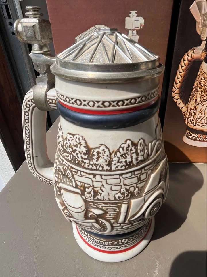 The car stein depicts raised images of four specific classic cars: the 1910 Stanley Steamer, 1936 MG, 1911 Ford Model-T, and 1927 Bugatti. It is approximately 8.75 inches tall from the base to the top of the handle ornament and around 4 inches wide at the base and weighs approximately 3 pounds.