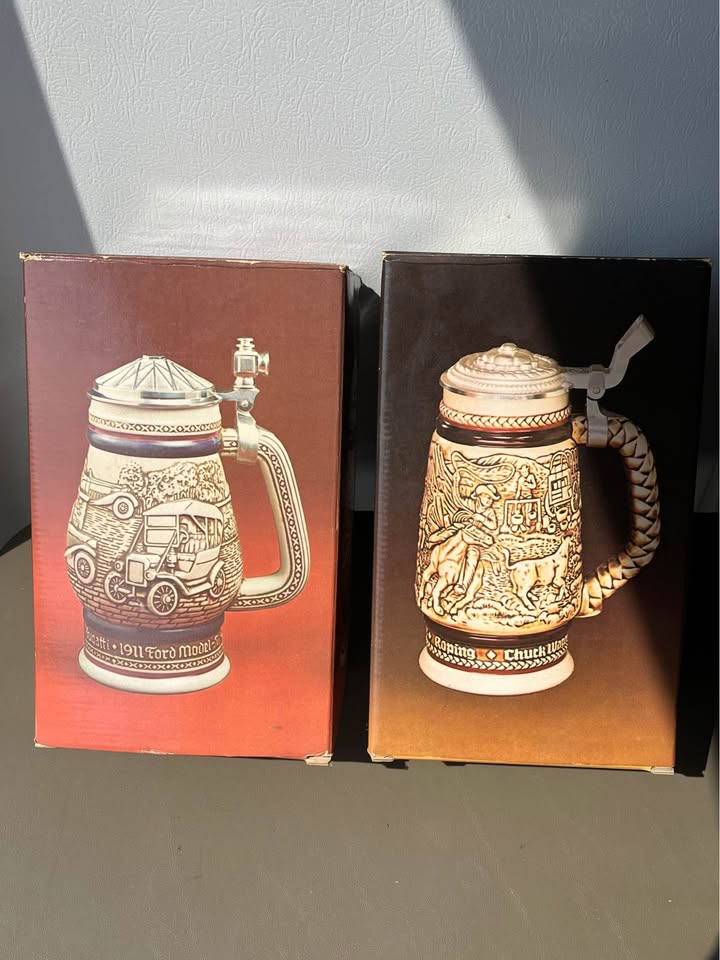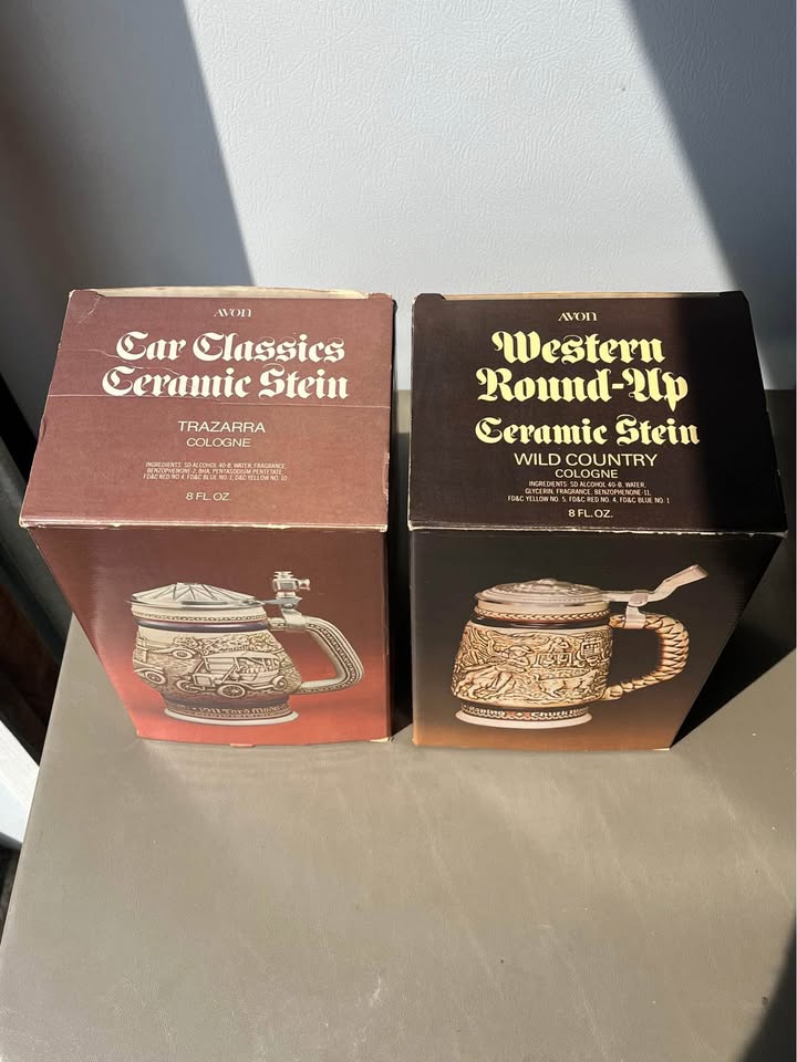 The original 1979 Avon Car Classics & 1980 Western Round-Up Ceramic Steins are vintage, collectible beer steins featuring classic cars and scenes from the Wild West. Each has a hinged lid and comes with the original plastic cologne bottle with the styrofoam inserts in the original box!