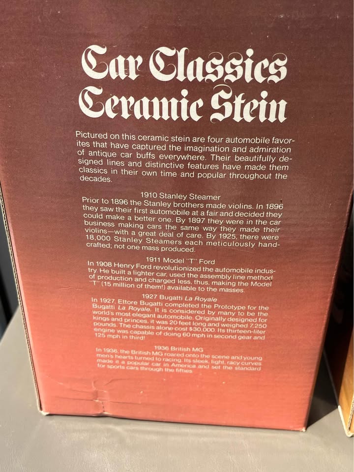 The car stein depicts raised images of four specific classic cars: the 1910 Stanley Steamer, 1936 MG, 1911 Ford Model-T, and 1927 Bugatti. It is approximately 8.75 inches tall from the base to the top of the handle ornament and around 4 inches wide at the base and weighs approximately 3 pounds.