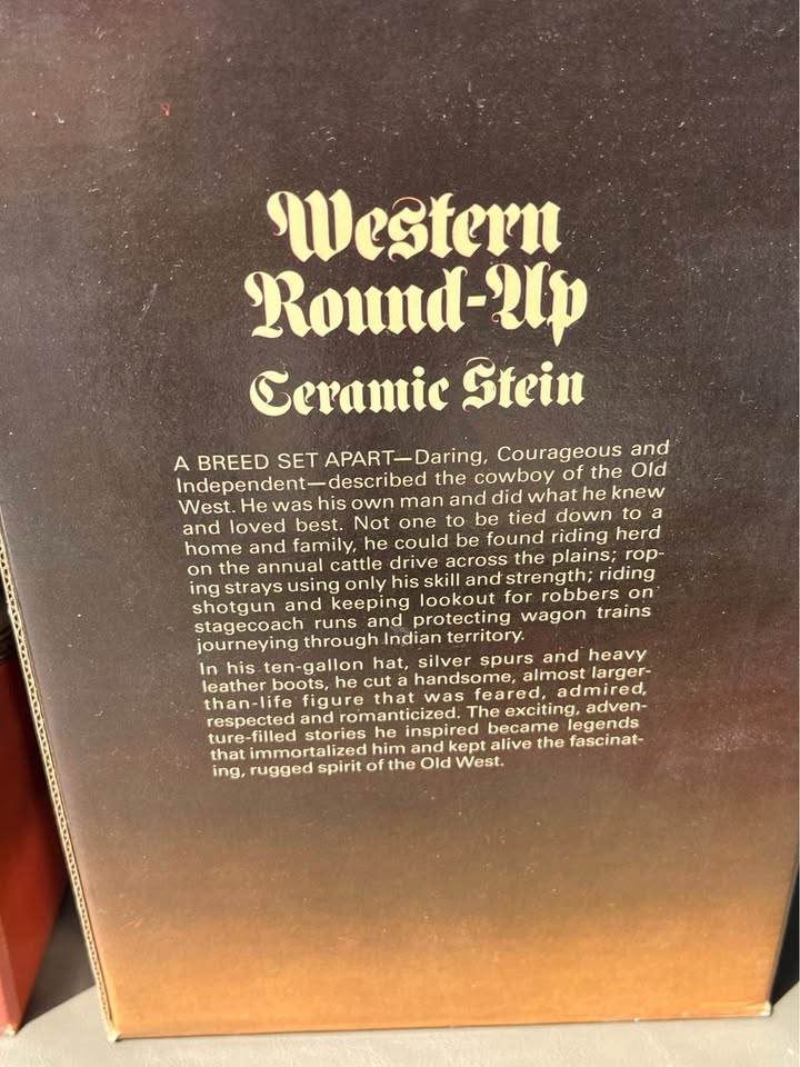 The 1980 Avon Western Round-Up Ceramic Stein with Wild Country Cologne is a collectible item that embodies the spirit of the American Old West. It was designed and handcrafted in Brazil for Avon Products, Inc., in 1980.