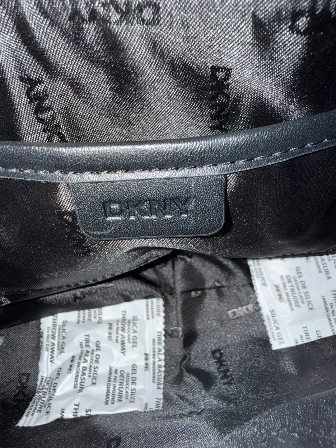 This DKNY shoulder bag features a classic all-over monogram print and comes with a matching coin pouch. It's a stylish accessory for everyday use. The bag is made of faux leather and fabric.