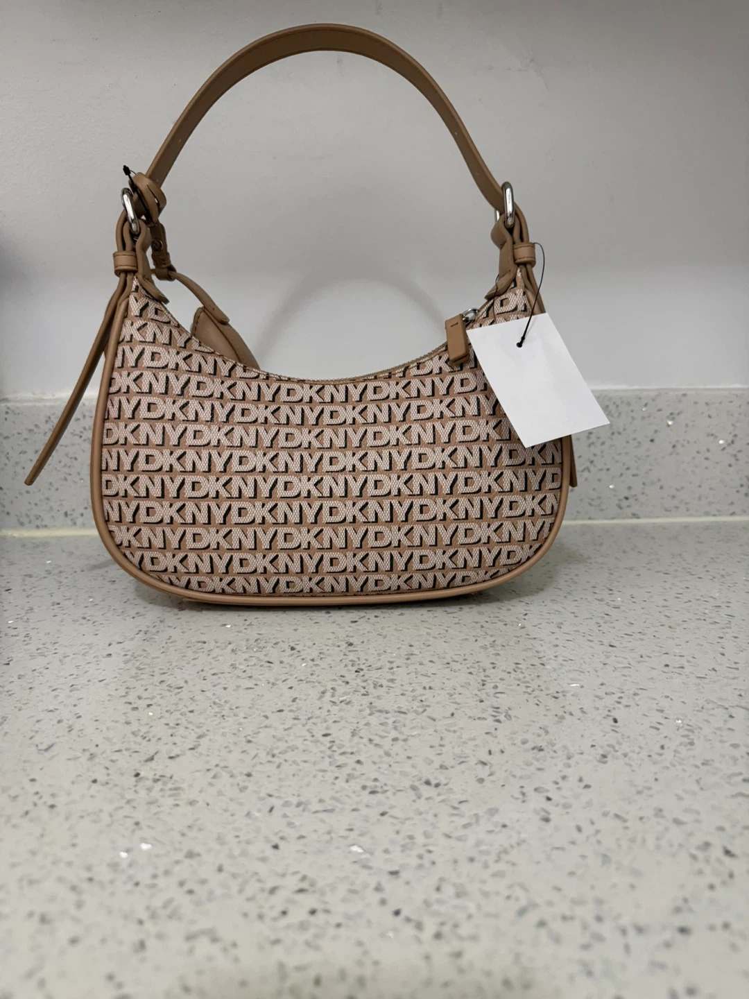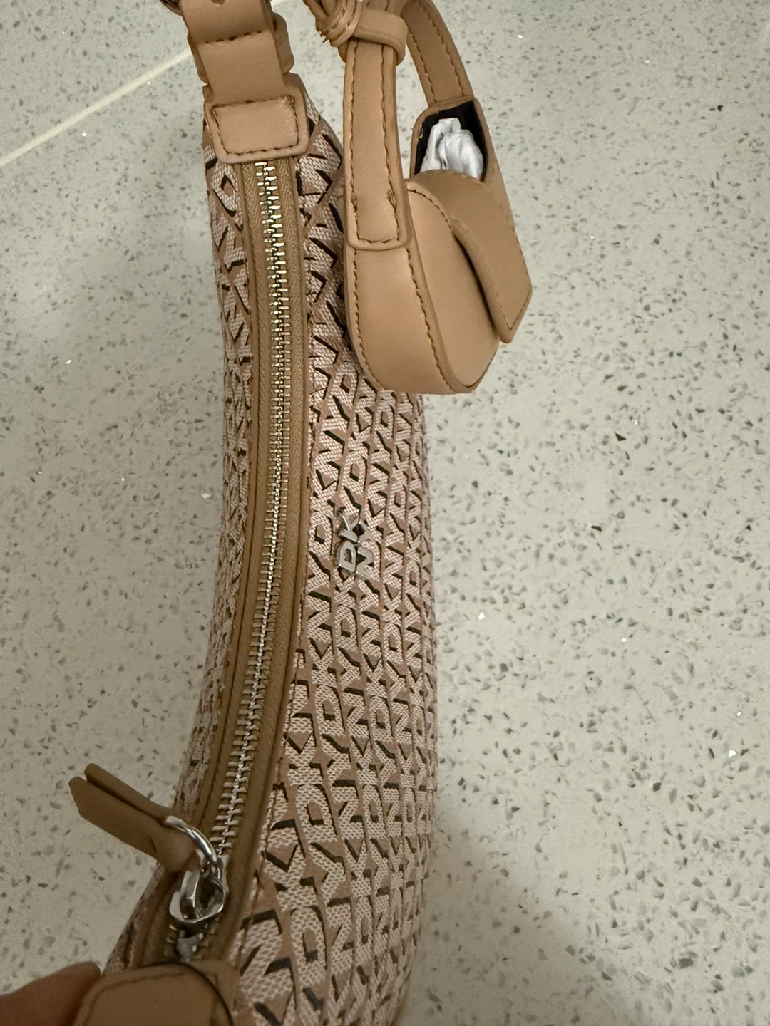 This DKNY shoulder bag features a classic all-over monogram print and comes with a matching coin pouch. It's a stylish accessory for everyday use. The bag is made of faux leather and fabric.