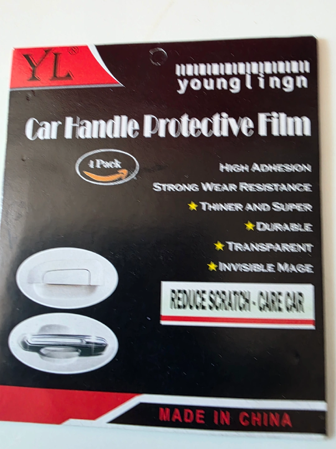 Selling a pack of YL car handle protective films. This pack includes 4 films designed to provide high adhesion and strong wear resistance. They are thin, super durable, transparent, and offer invisible mage protection to reduce scratches and care for your car. Made in China. Available for pick up in Bath Beach Brooklyn