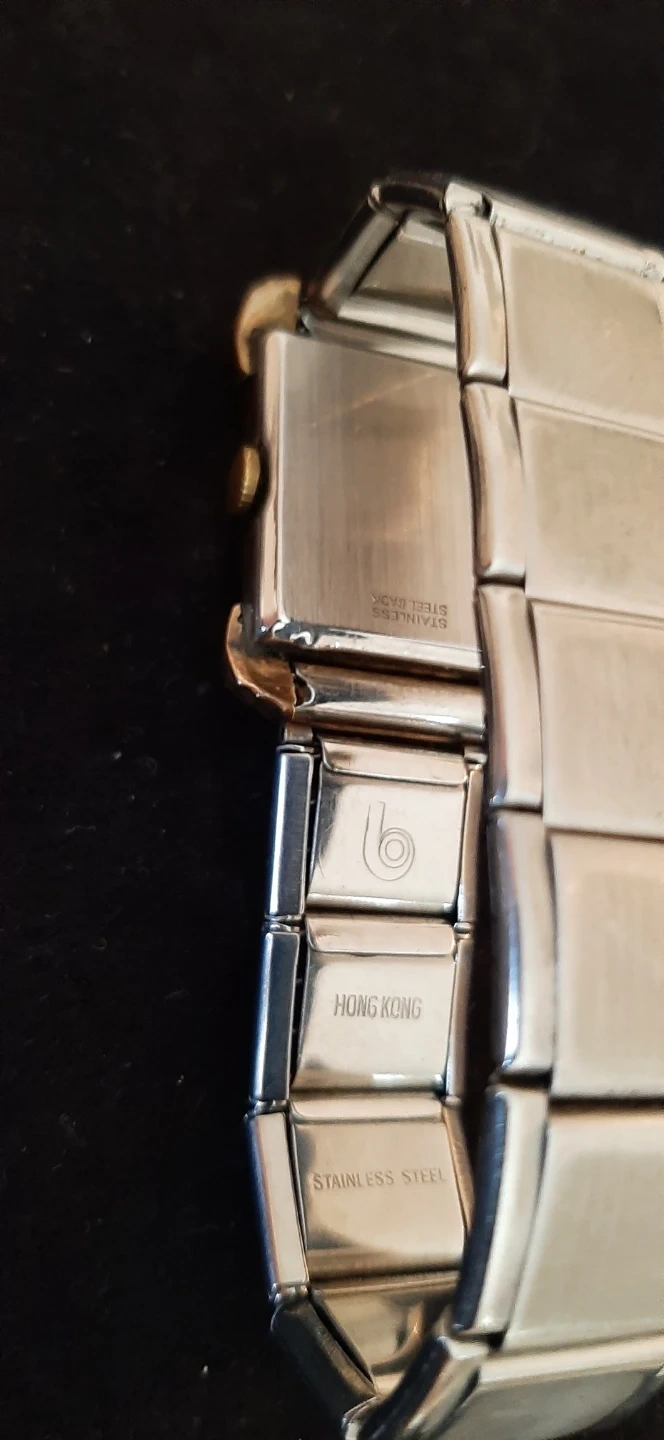 Vintage Hampden Ladies Shock-Protected watch. It has a stainless steel band and a square face. The band is marked "Hong Kong" and "Stainless Steel".