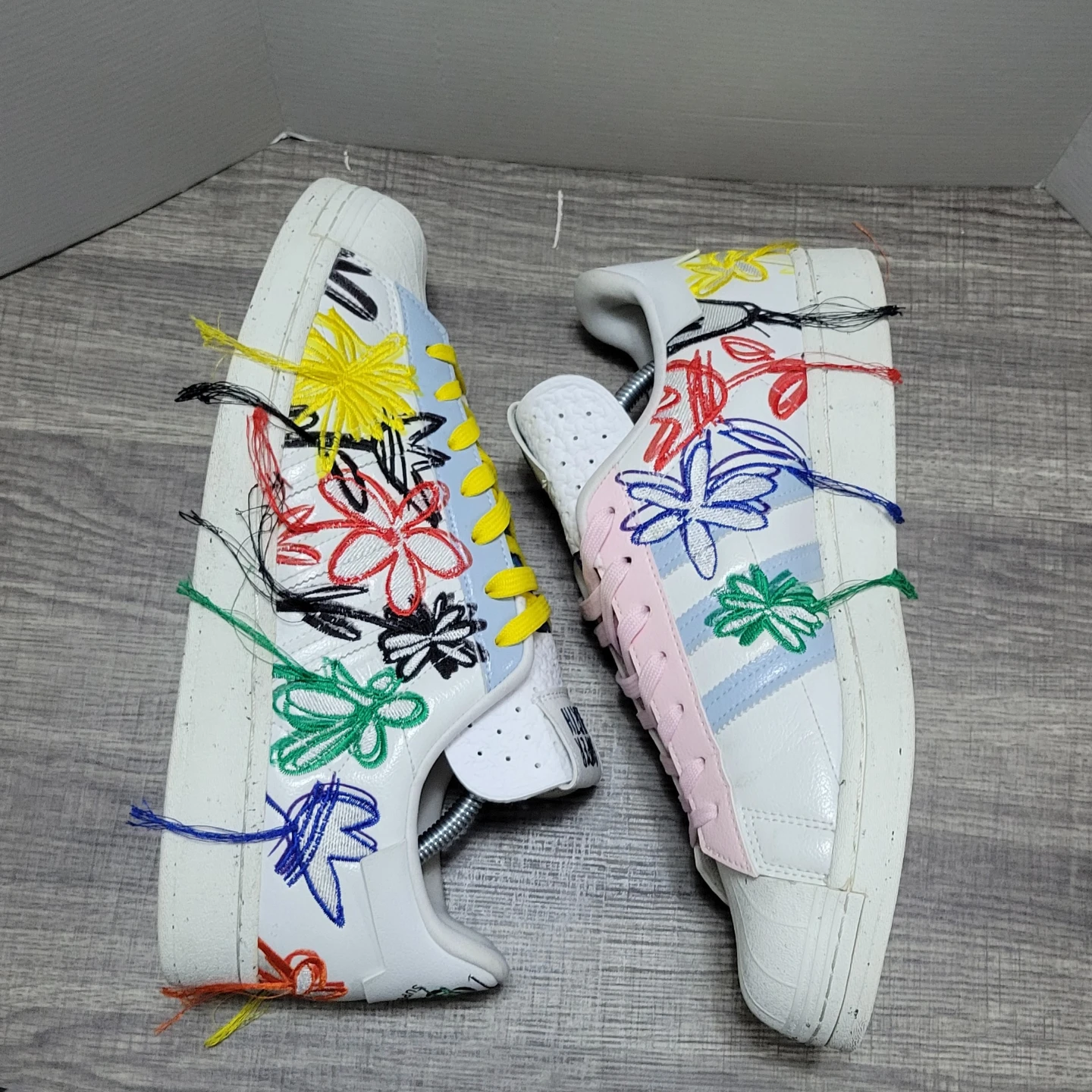 Adidas Superstar "Super Earth" sneakers with colorful embroidered floral details. Includes original box and extra laces in yellow, pink, and white. These shoes are a size 10.5.