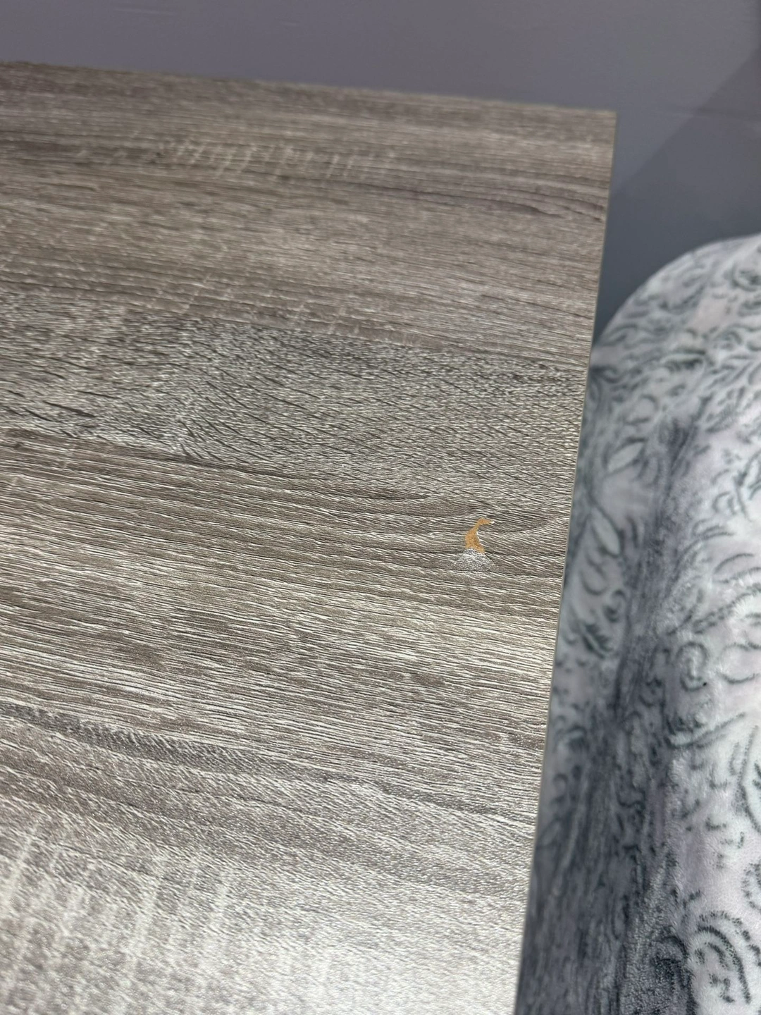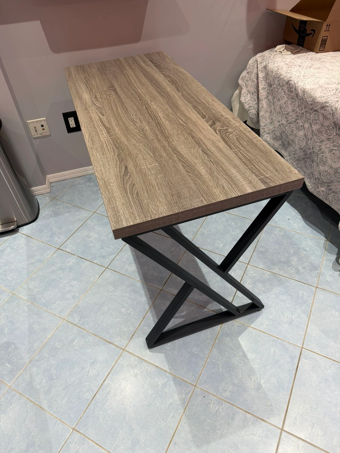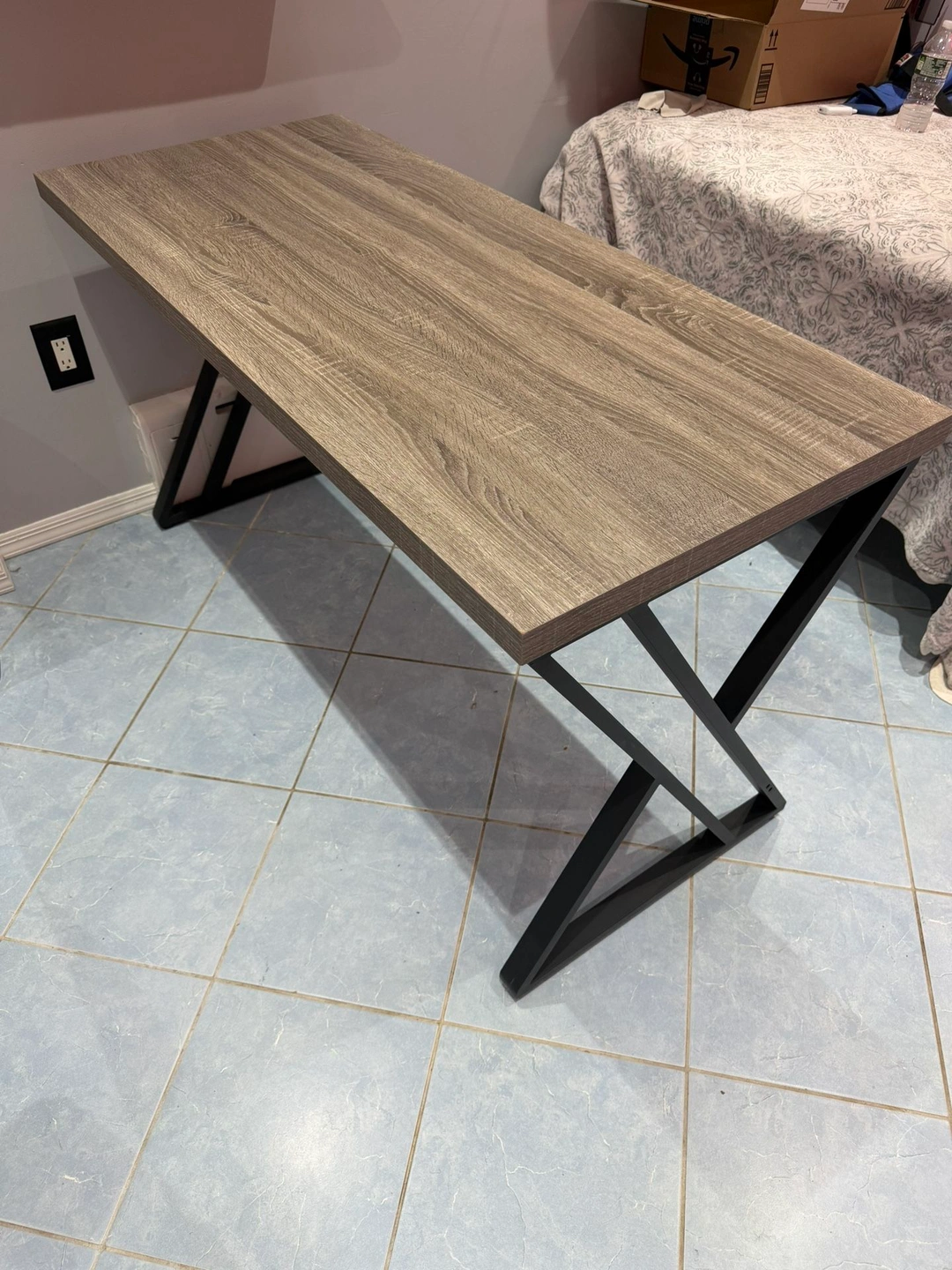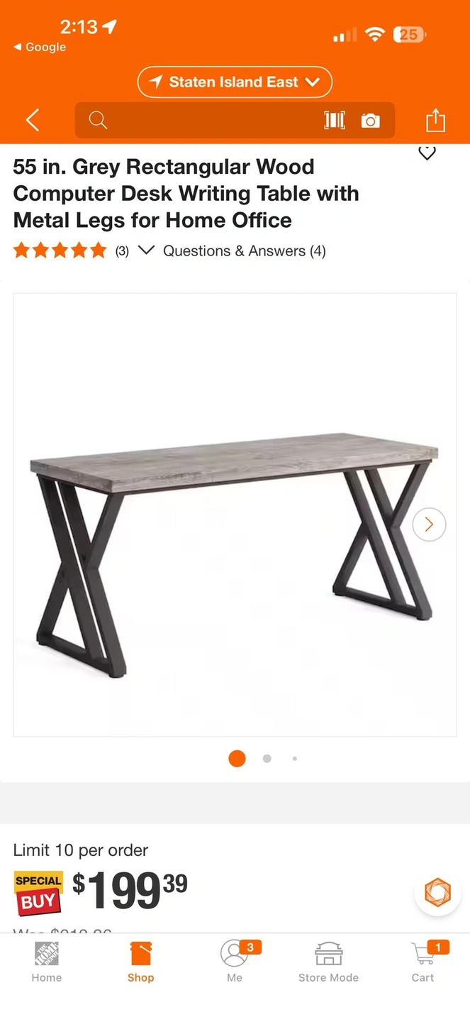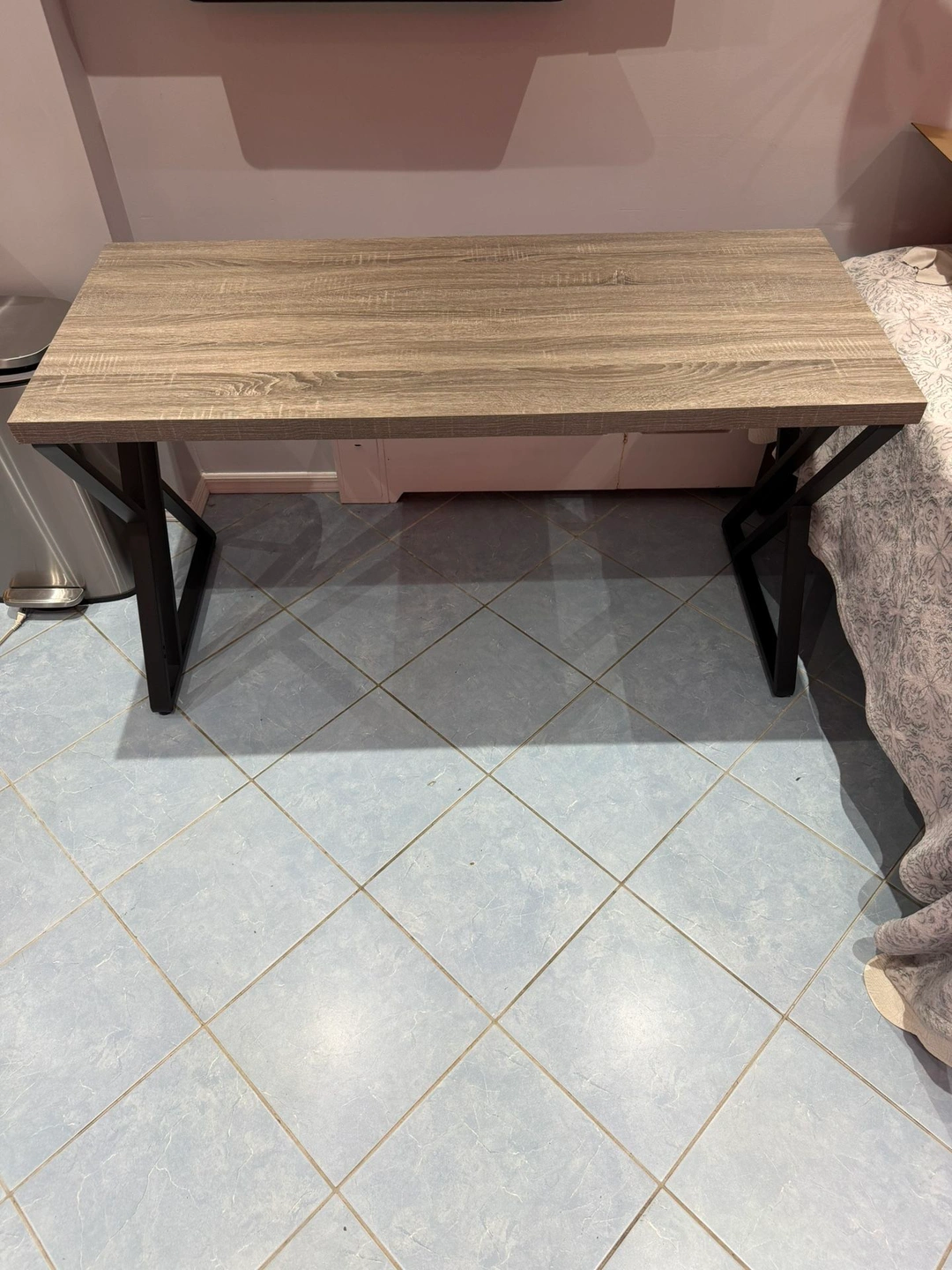 55 in. Grey Rectangular Wood Computer Desk Writing Table with Metal Legs. Dimensions: H 29.5 in, W 55 in, D 23.6 in. Small damage on the top pictured. Material: MDF/Chipboard.