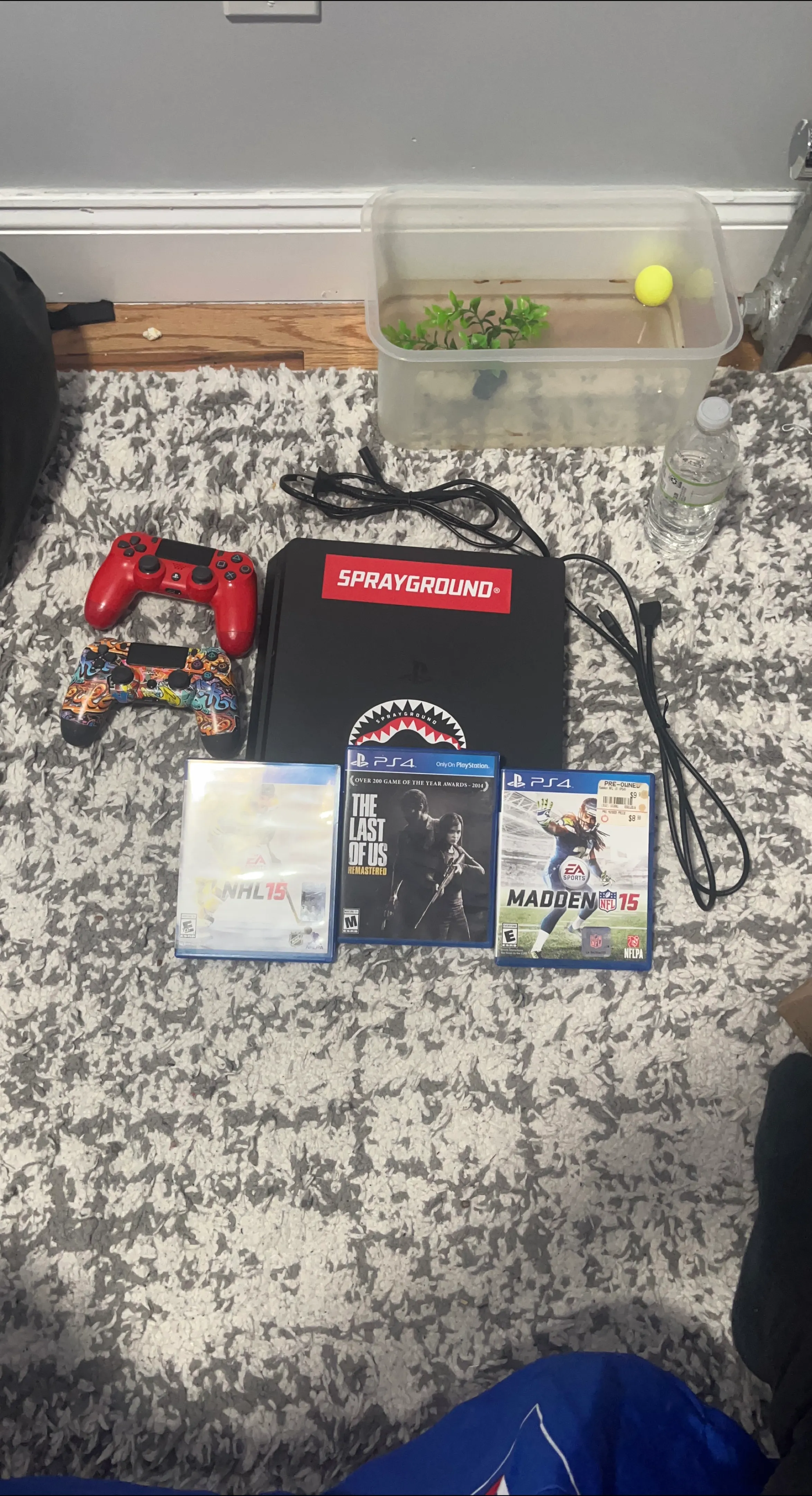 Selling a PlayStation 4 console with a Sprayground sticker, along with two controllers and three games: NHL 15, The Last of Us Remastered, and Madden NFL 15