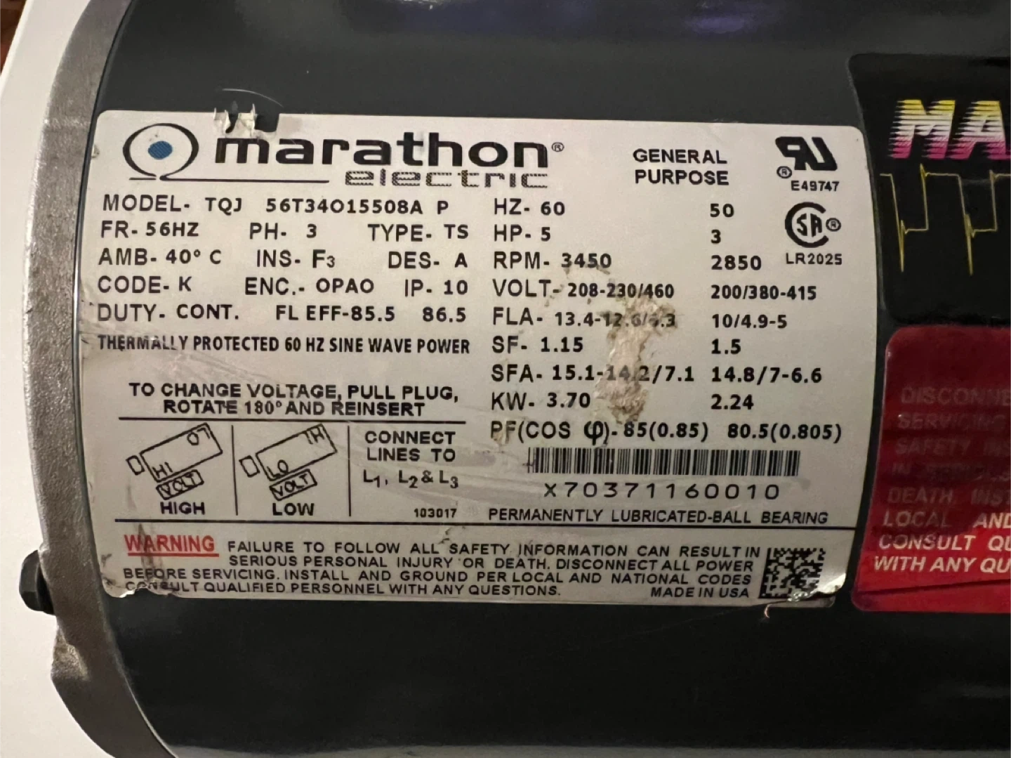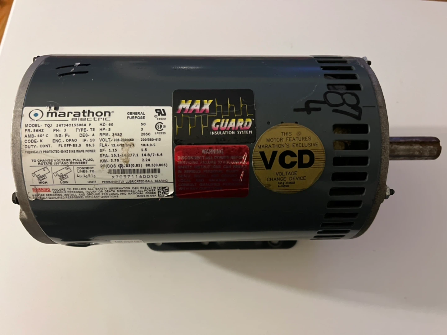 This is a Marathon Electric general purpose motor. It's a 5 HP motor with a 56T frame. It runs on 230/460V and is 60Hz. The motor features permanently lubricated ball bearings. New, pick up is in Woodland Park NJ or I can ship.