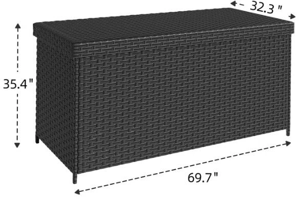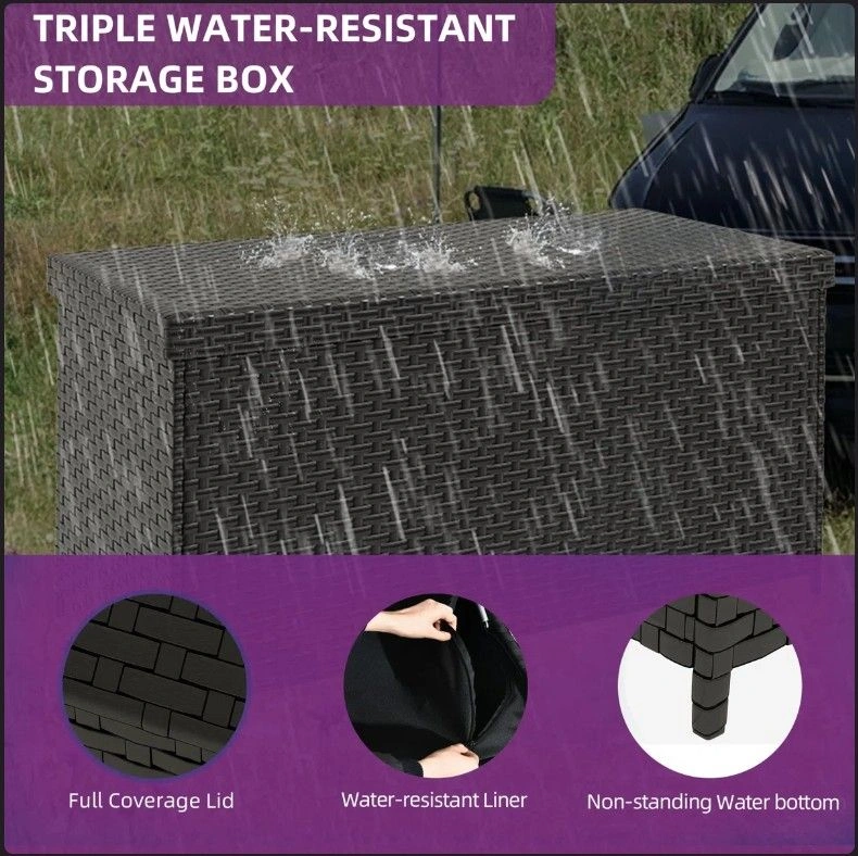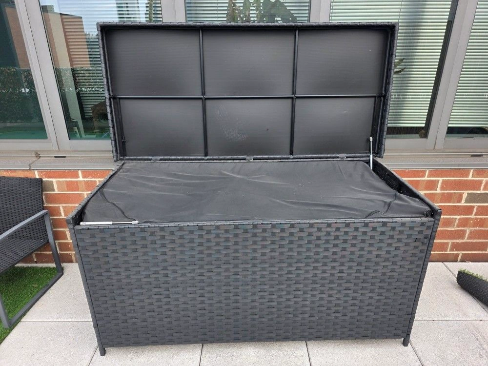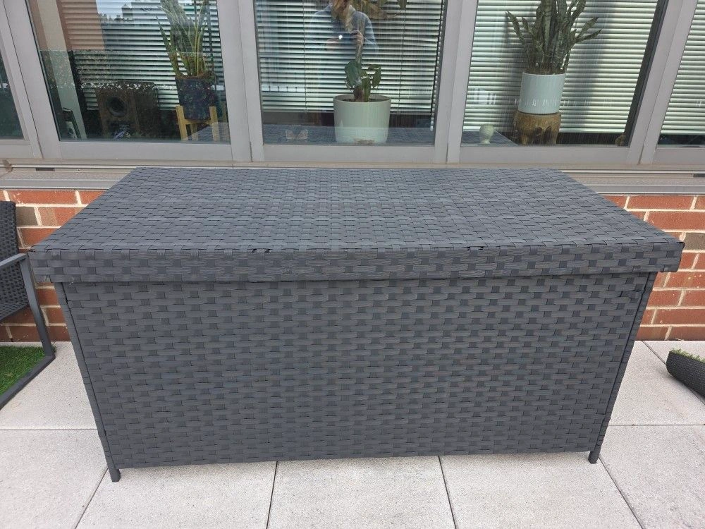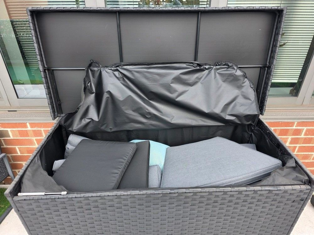 Near-new condition, purchased about a year ago. This indoor/outdoor storage box is designed to withstand any weather. Its watertight lid and inner zippered bag keep belongings dry. With a spacious 260-gallon capacity, it's great for storing cushions, pool gear, and more, keeping your outdoor space tidy. Cleaning is easy – just wipe down or rinse with a hose. Features include water-repellent protection, 260 gallons of storage, all-weather durability with weather-proof rattan and hydraulic pistons, and easy cleaning.
