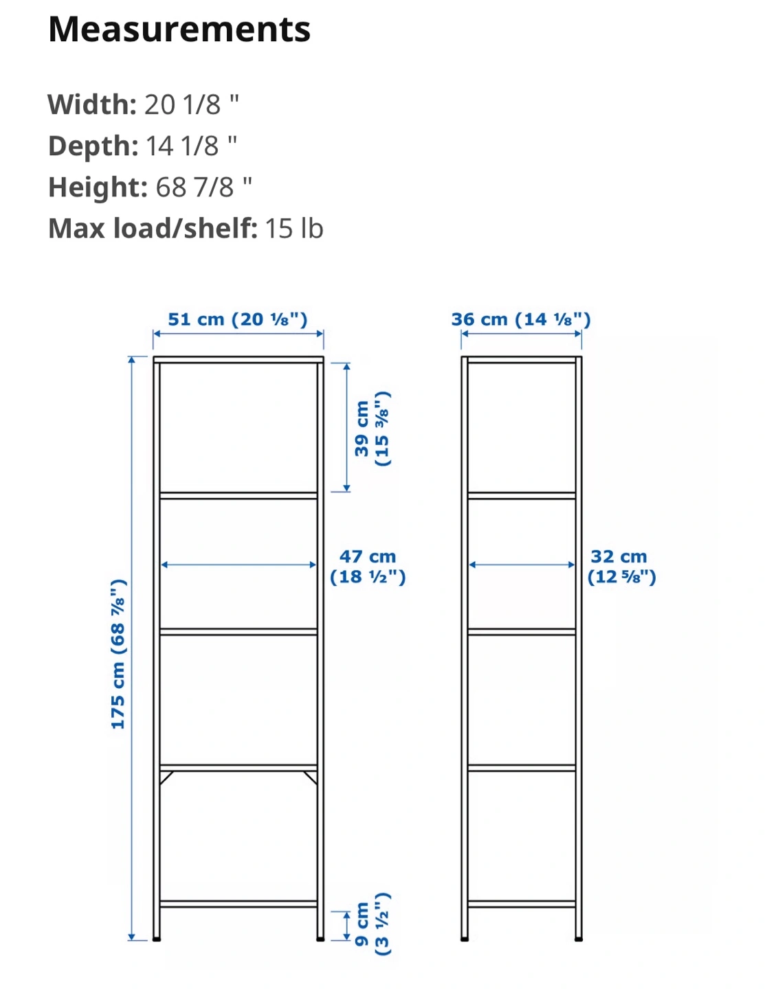 - Max load/shelf: 15 lb