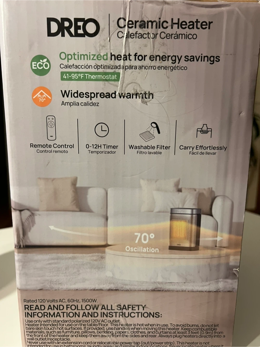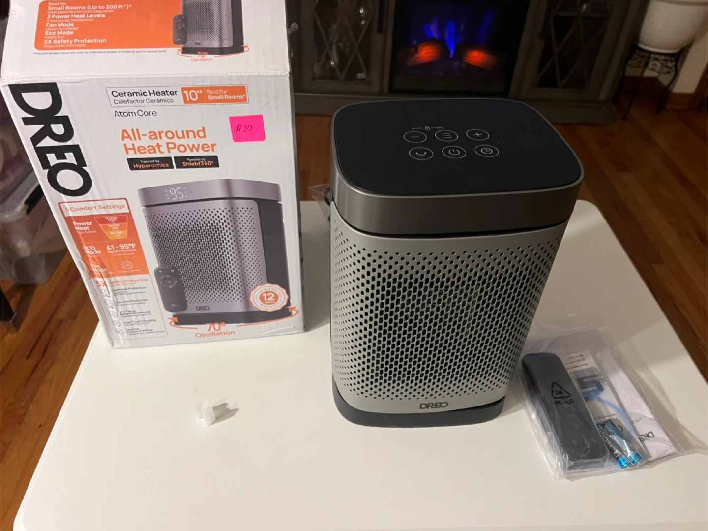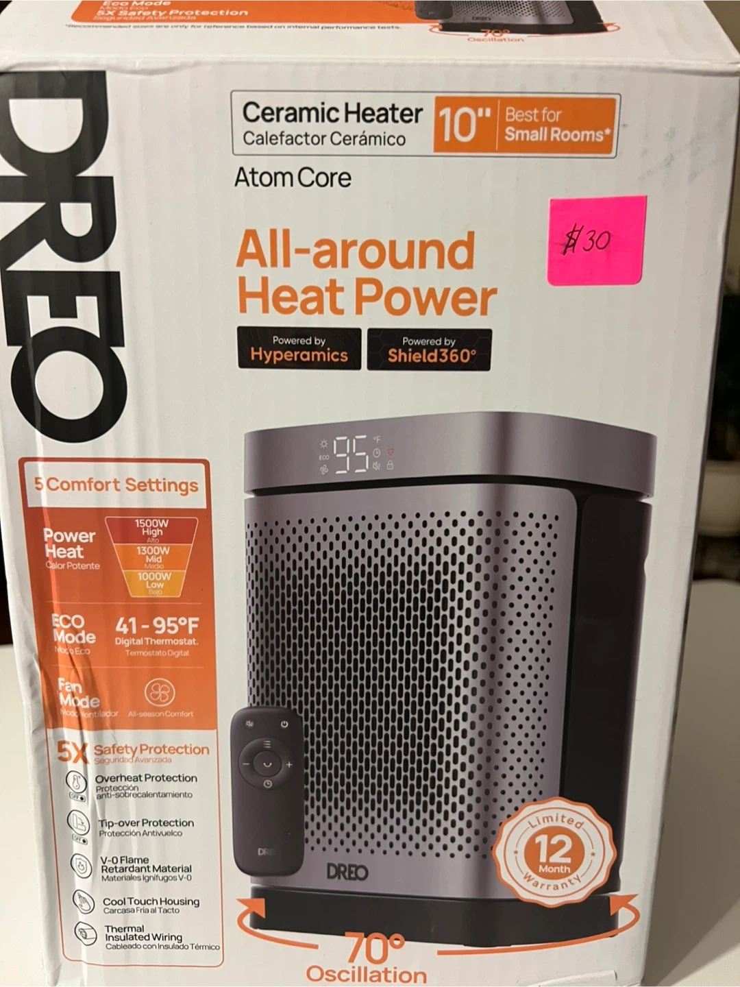 This Dreo ceramic heater offers all-around heat power for small rooms. It features 5 comfort settings, including heat and eco modes, and a digital thermostat. Includes remote and batteries. 12-month limited warranty.