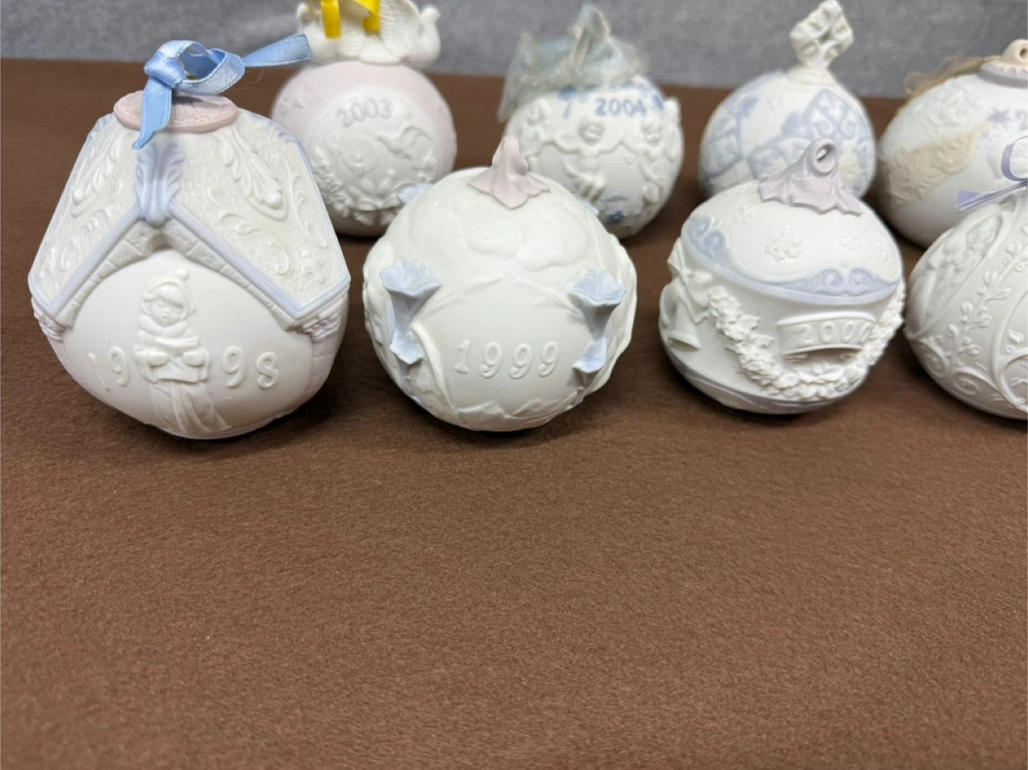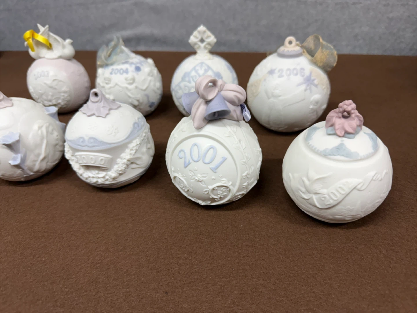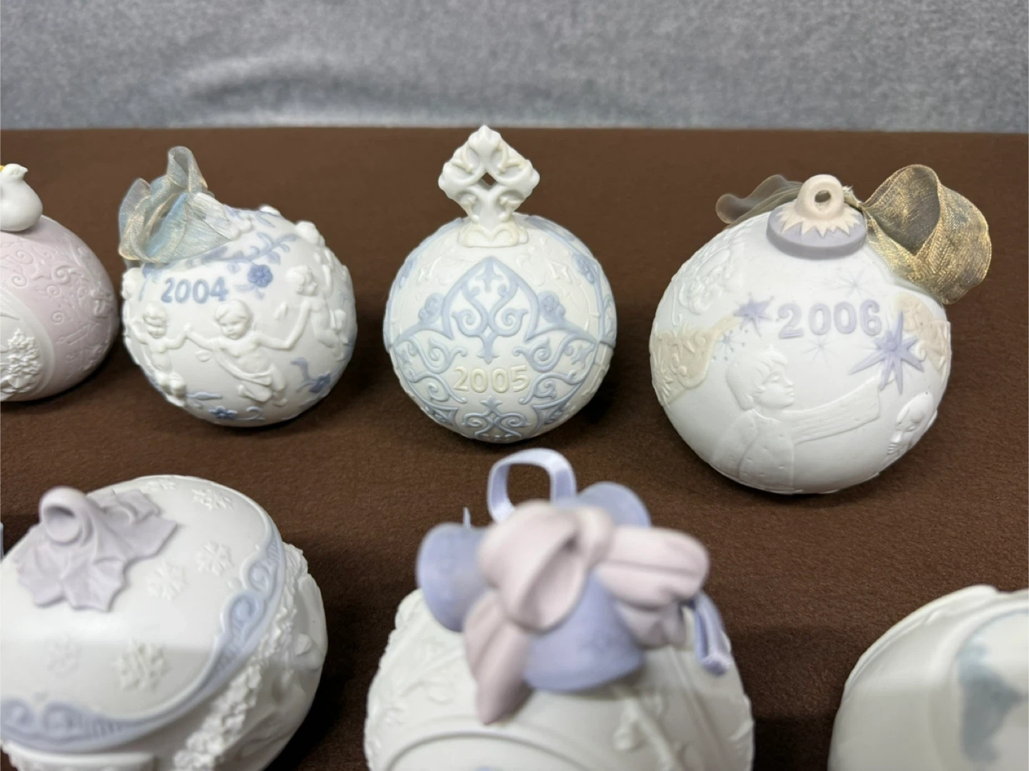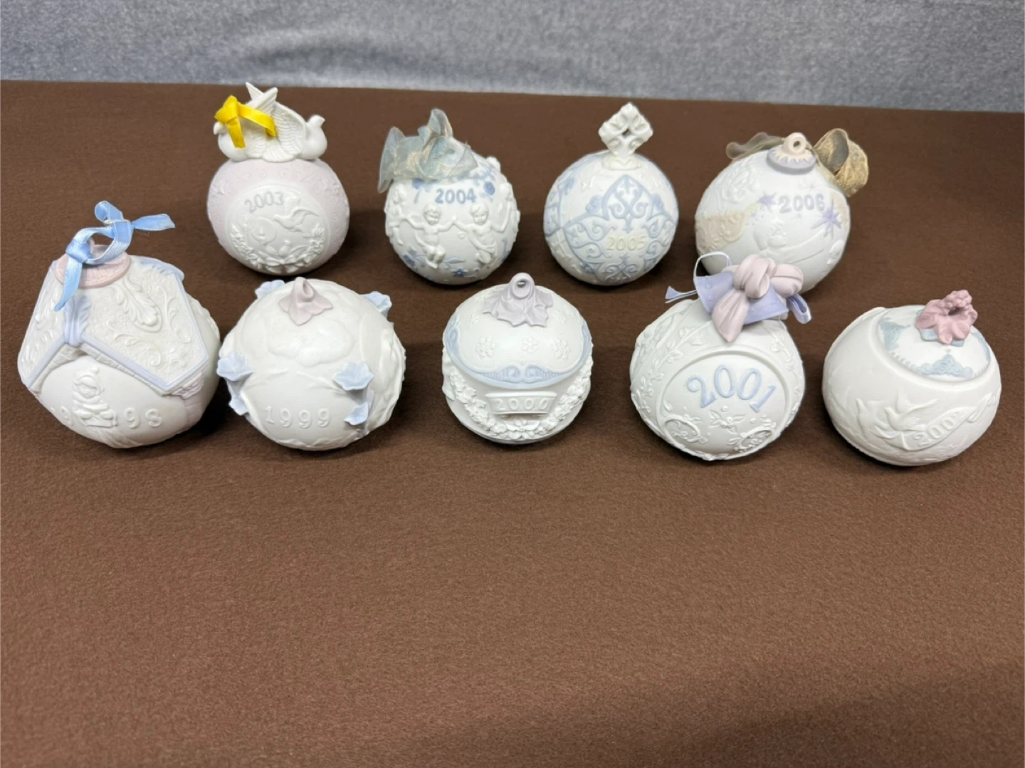 Lladro Christmas Ornament Lot 1998-2006 Porcelain Holiday Ball Set Spain Set of decorative ornaments, each dated with a year from 1998 to 2006. These collectible pieces feature intricate designs and year markings.