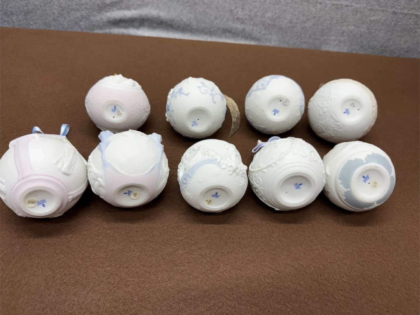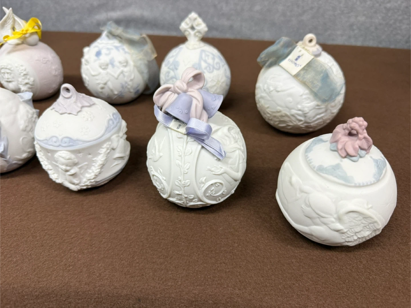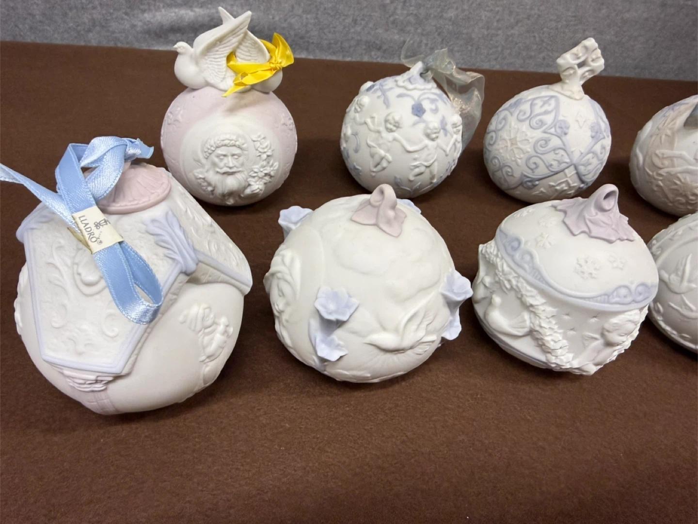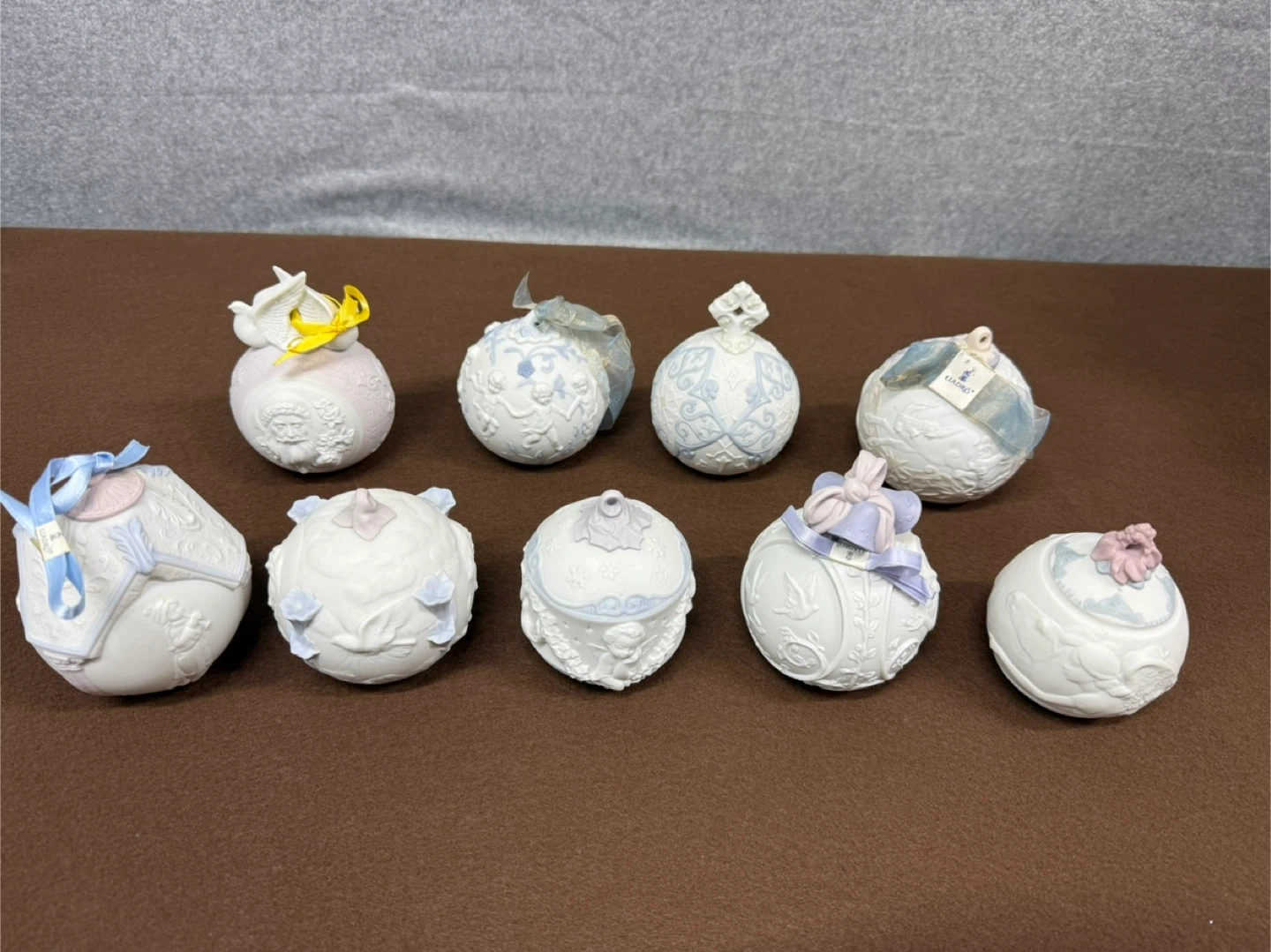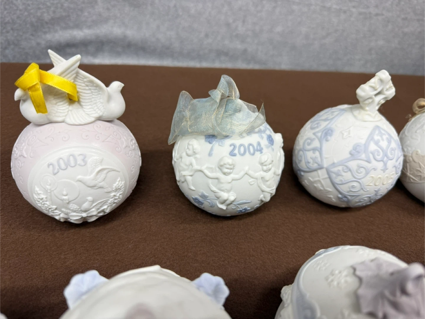 Lladro Christmas Ornament Lot 1998-2006 Porcelain Holiday Ball Set Spain Set of decorative ornaments, each dated with a year from 1998 to 2006. These collectible pieces feature intricate designs and year markings.