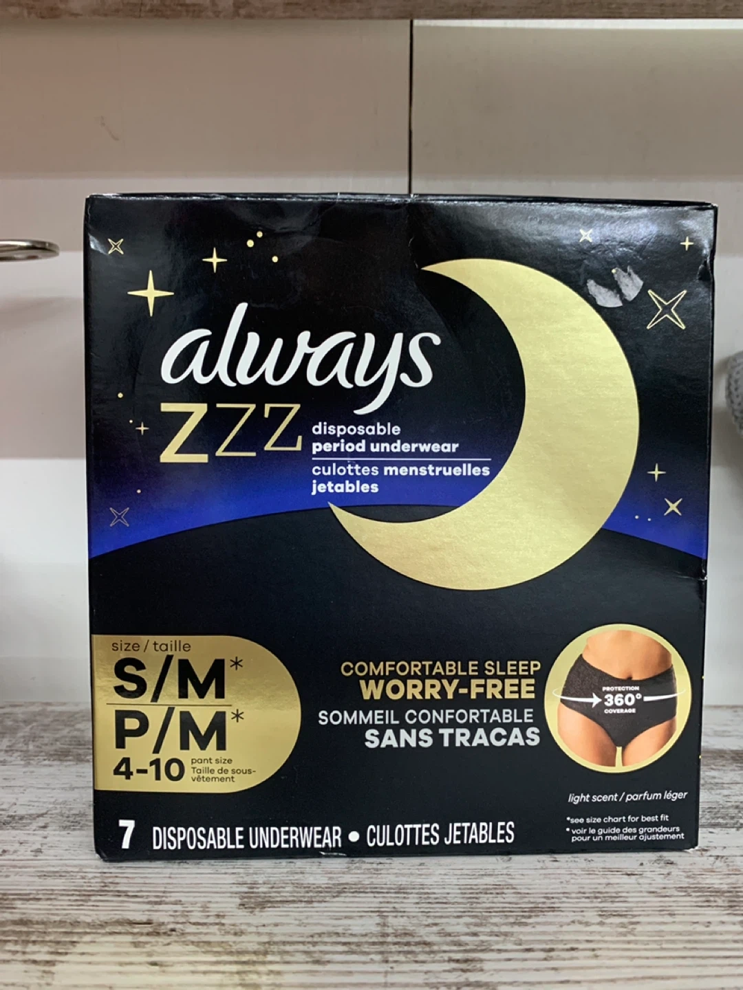 Giving away a box of Always ZZZ disposable period underwear. The size is S/M, which fits pant sizes 4-10. These are designed for comfortable sleep and worry-free protection