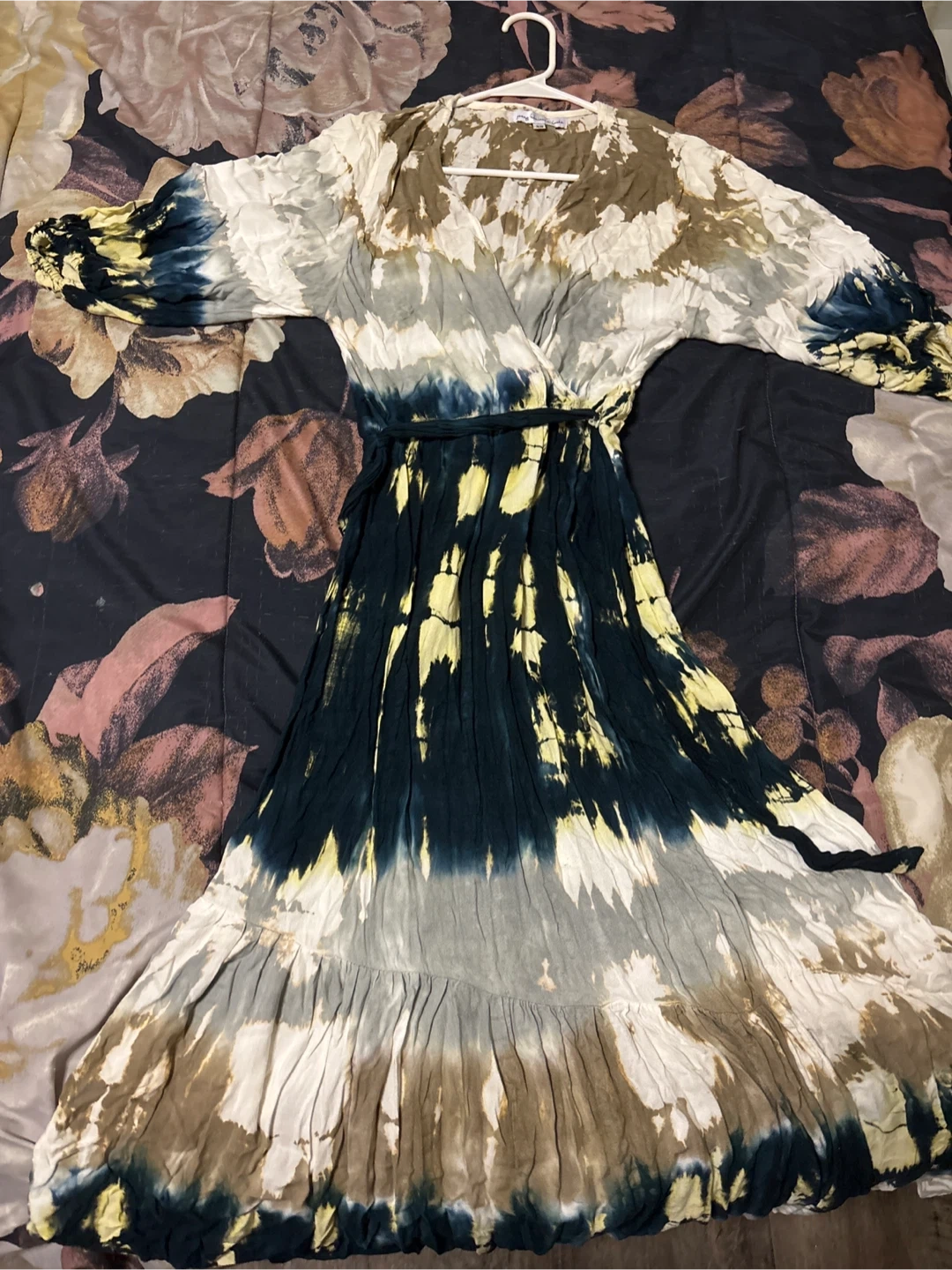 Flowy tie dye maxi dress in good condition! It's perfect for a casual day out or a summer evening. The dress features a flattering wrap style and a comfortable fit.