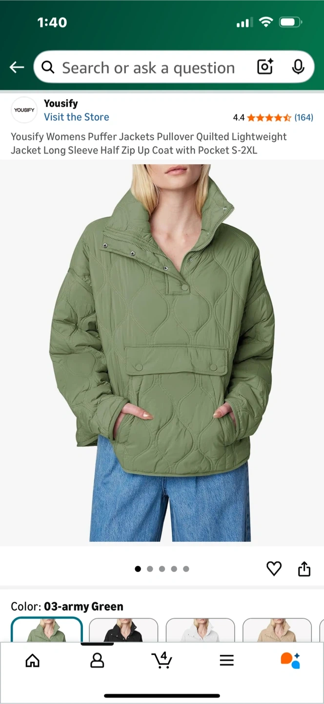 5Selling a Yousify women's puffer jacket. This is a pullover, quilted, lightweight jacket with a long sleeve and half zip up coat. It also has a pocket. The color is army green and the size is an XL