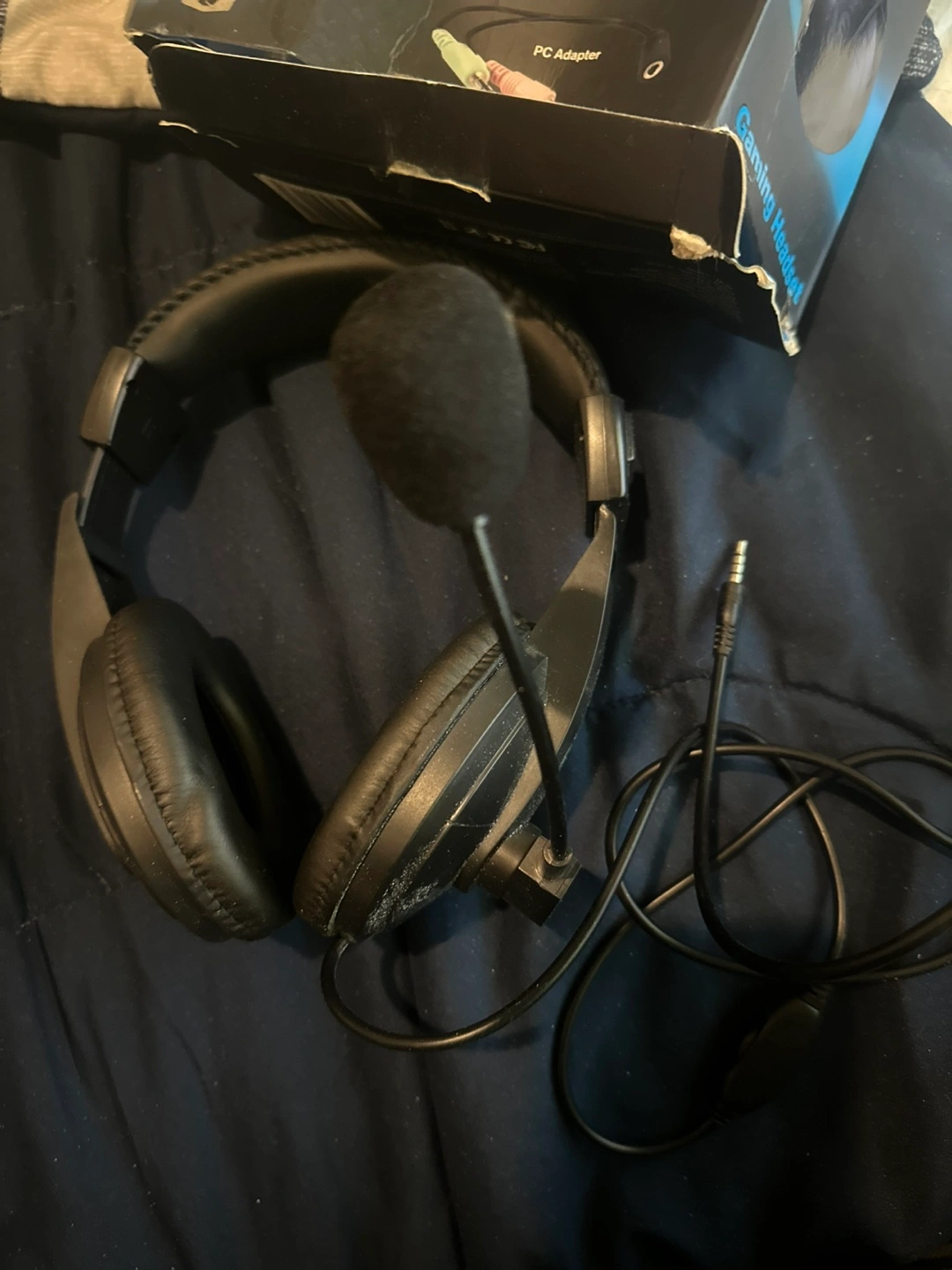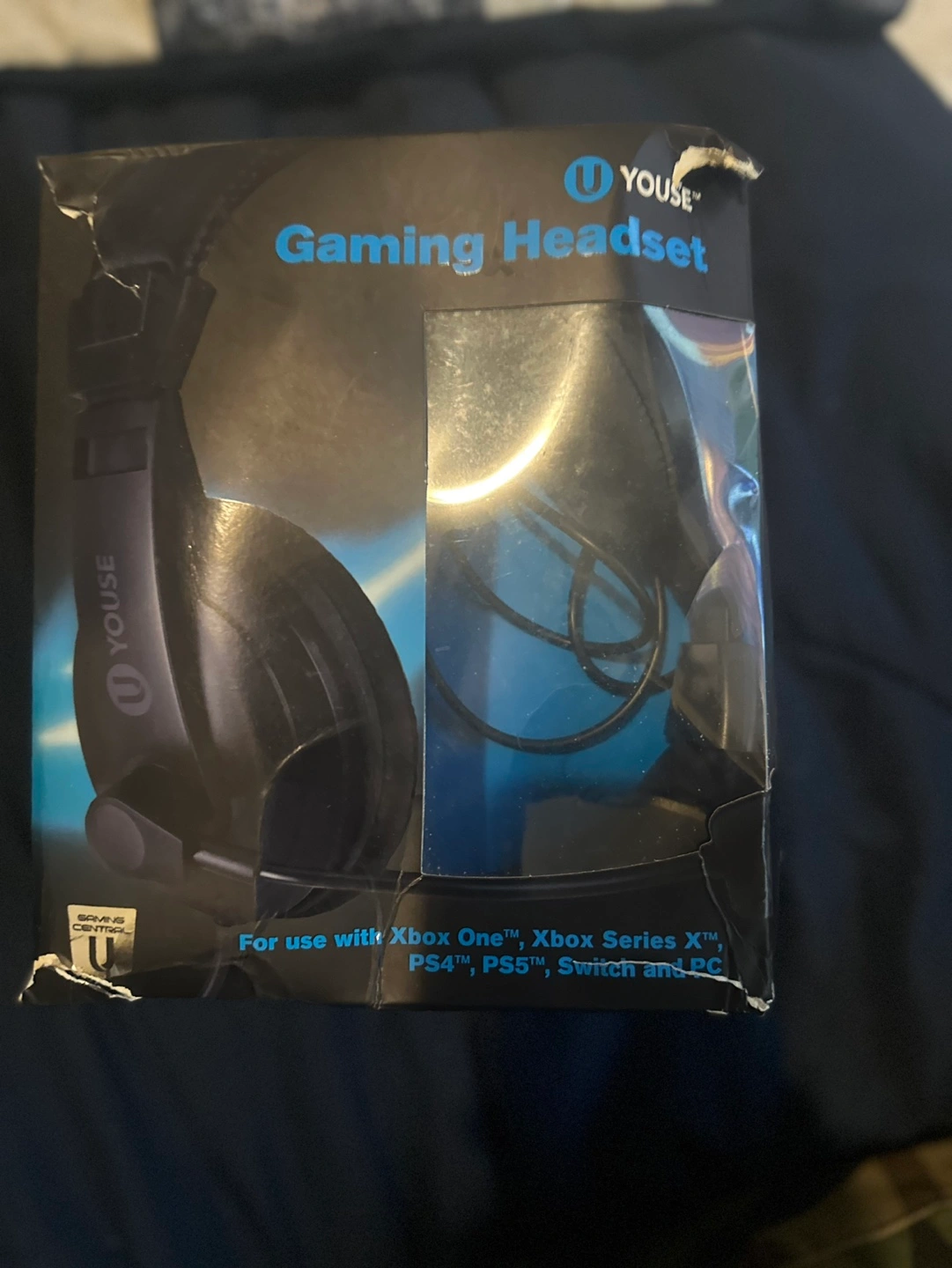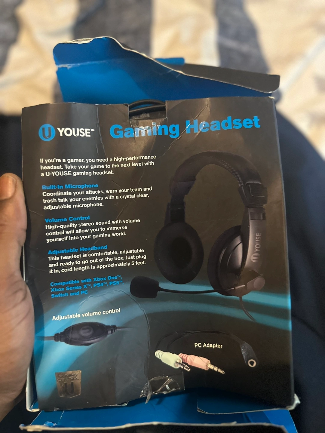 85New YOUZE gaming headset. Works with Xbox One, Xbox Series X, PS4, PS5, Switch and PC. Features a built-in microphone and adjustable headband. Adjustable volume control. Approximately 5-foot cord length.