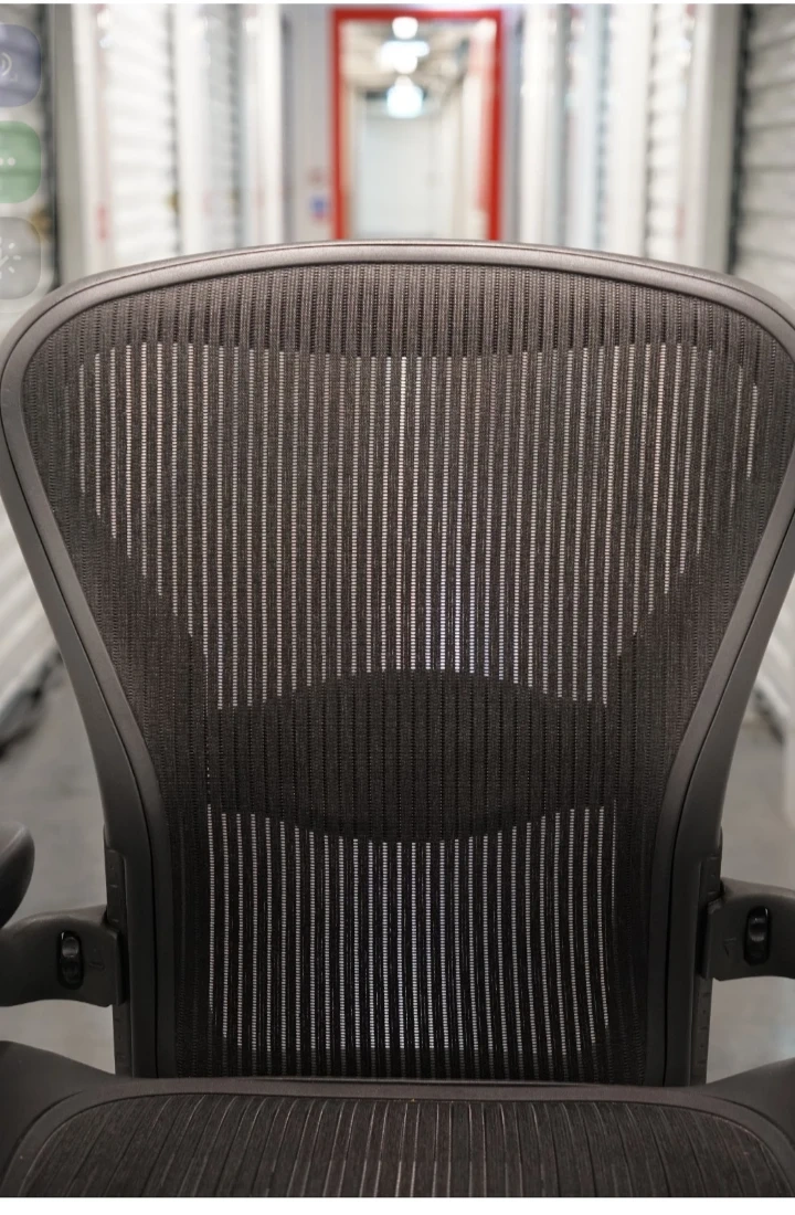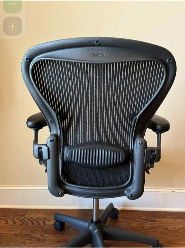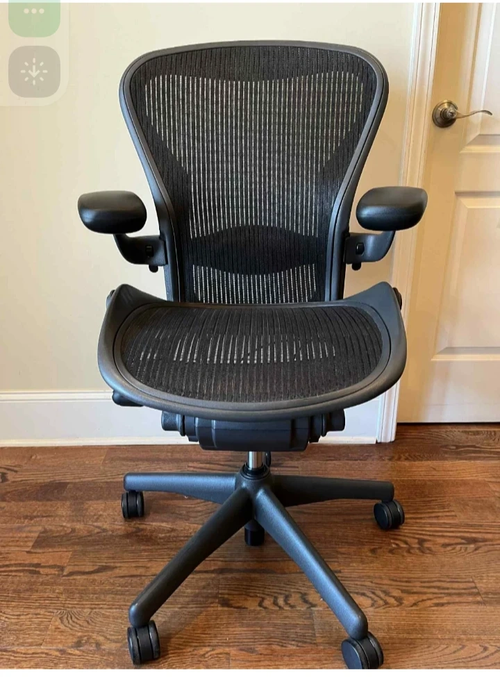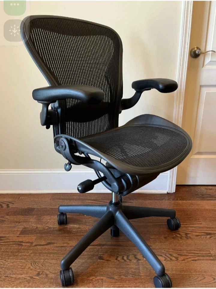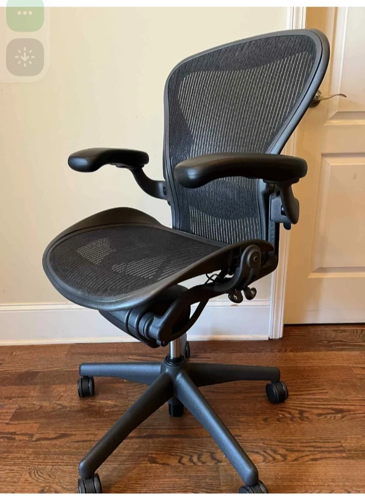 This is a Herman Miller Aeron chair. It's black with a mesh back and seat. The adjustable arms offer great support. It's a classic ergonomic office chair.