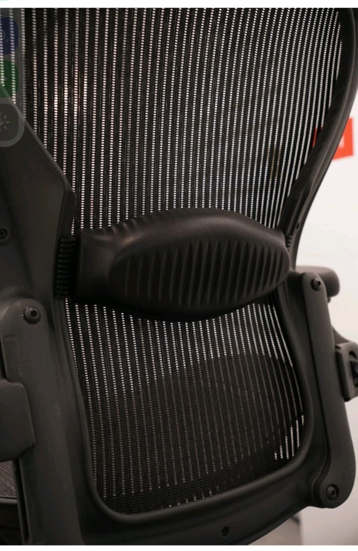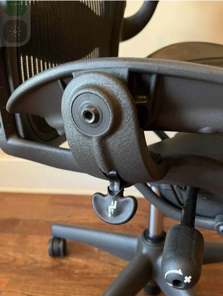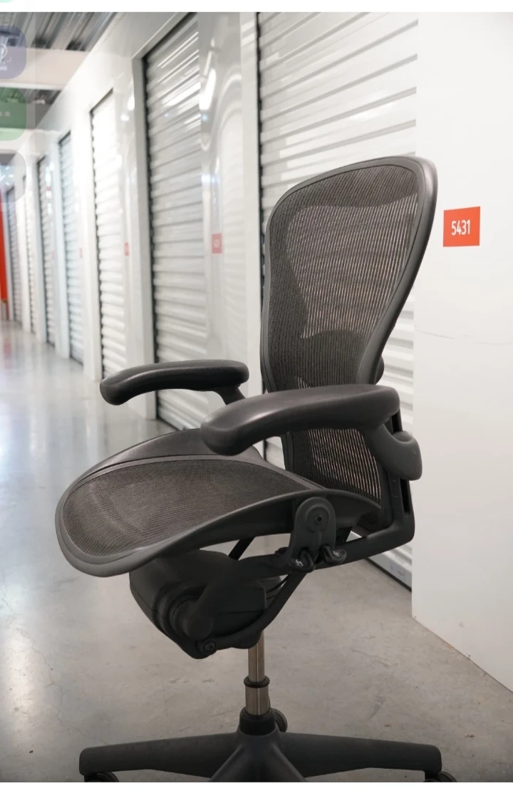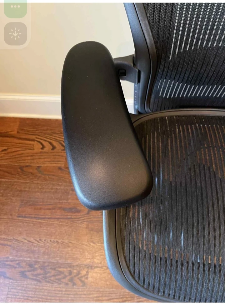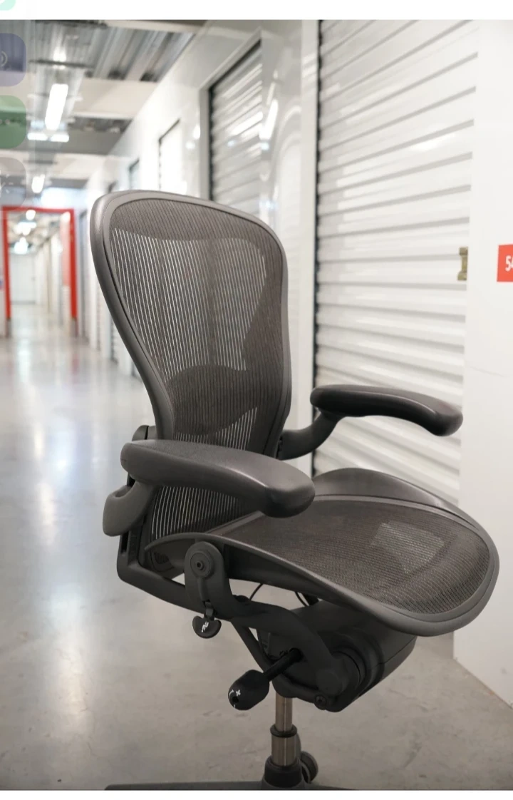 This is a Herman Miller Aeron chair. It's black with a mesh back and seat. The adjustable arms offer great support. It's a classic ergonomic office chair.
