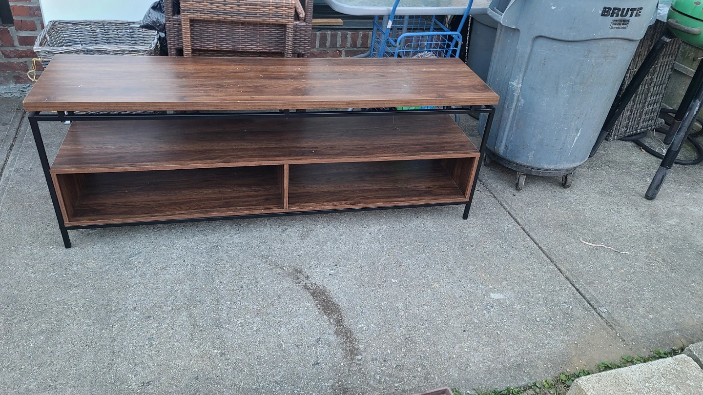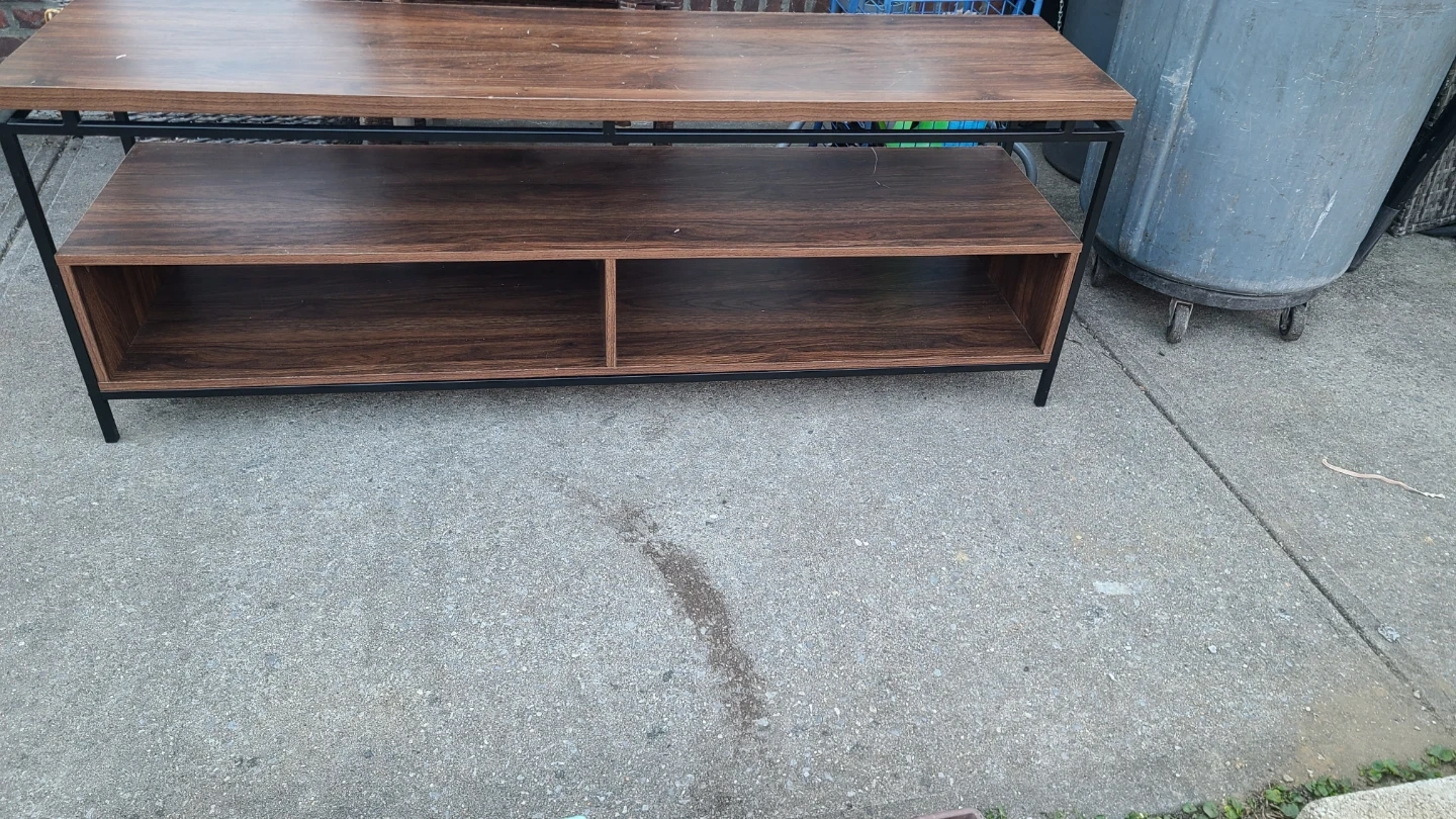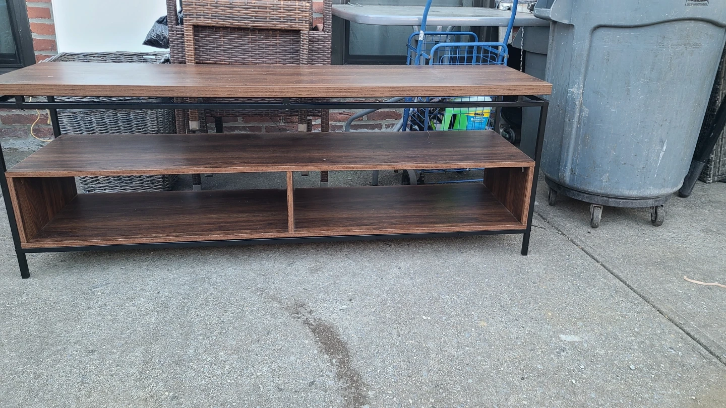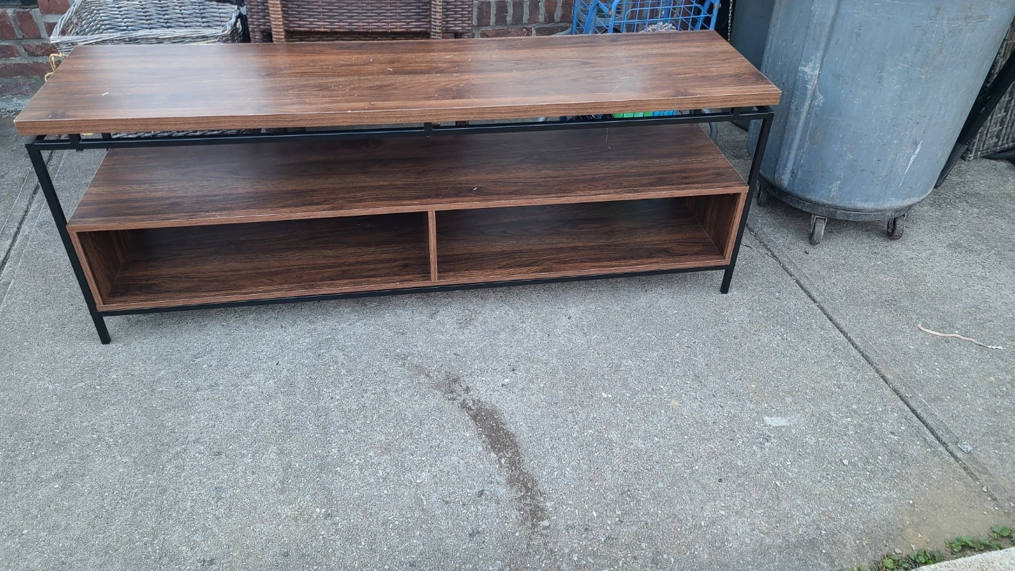 This media console has a wood grain finish with a black metal frame. It features two open shelves for storage. Perfect for a TV stand or general storage! Measure 60 inch long by 15.5 inch wide by 22 inch high