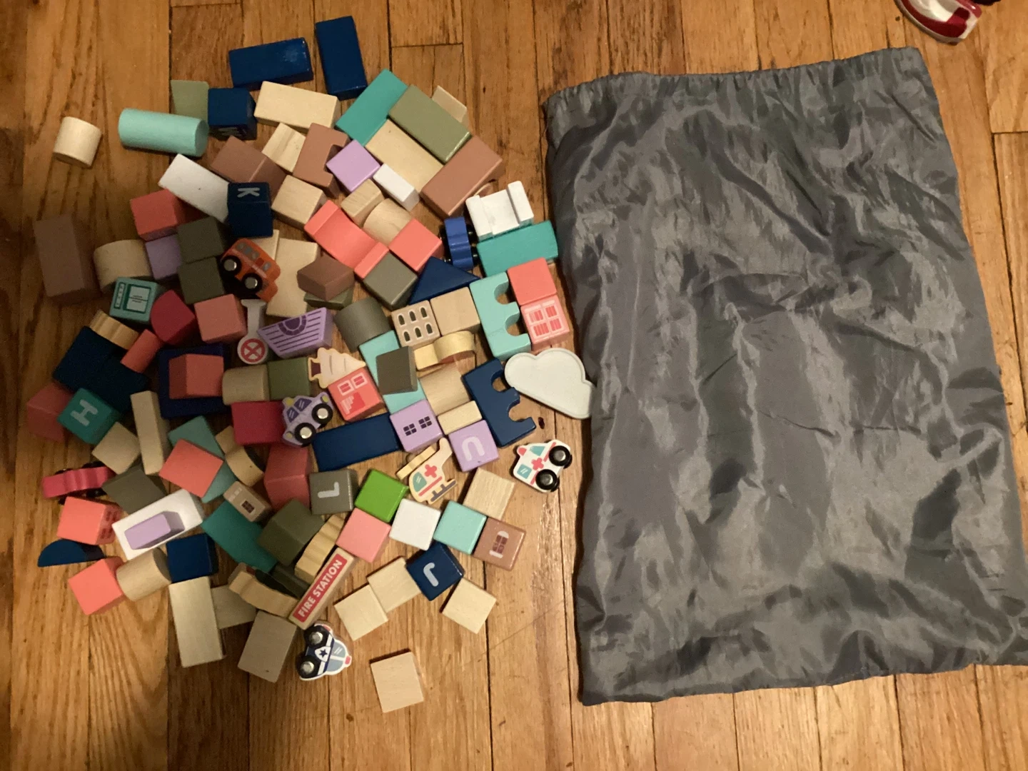 A collection of colorful wooden building blocks in various shapes and sizes. It includes blocks depicting houses, vehicles, and a fire station. A gray drawstring storage bag is also included for easy cleanup and transport. These blocks are great for imaginative play and developing fine motor skills.