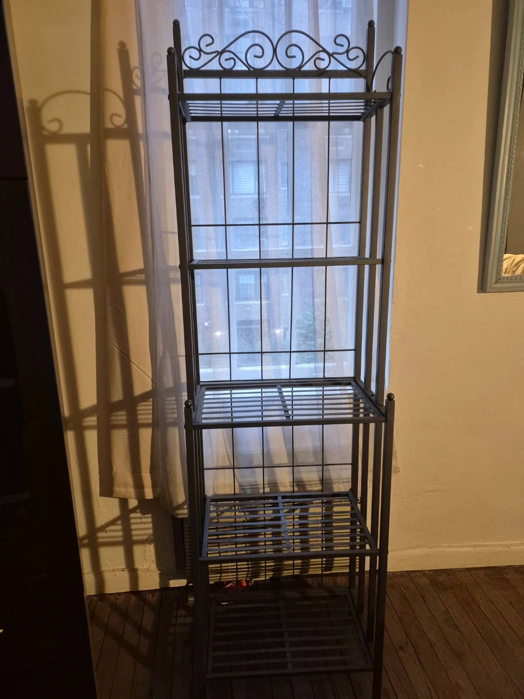 This wrought iron baker's rack offers four levels of storage. It's a metal construction with an ornate top scroll detail. Perfect for kitchens or any room needing extra shelving!