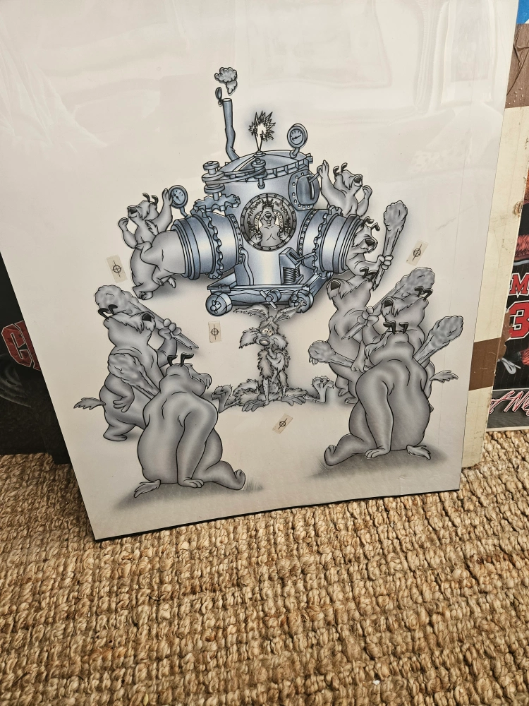Cartoon print featuring Wiley Coyote a mechanical contraption with a figure inside and surrounded by other figures in a circle.