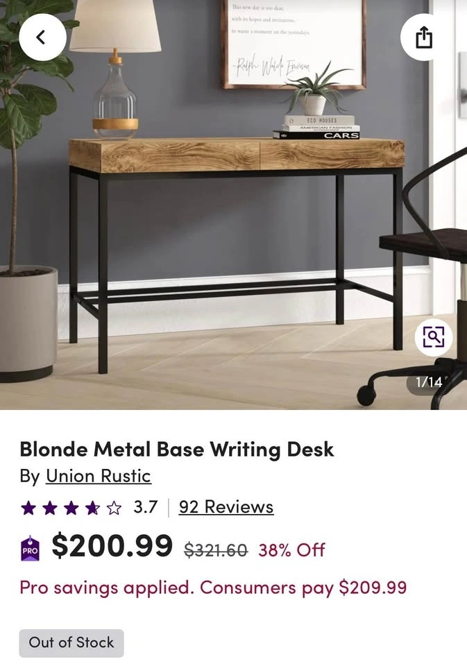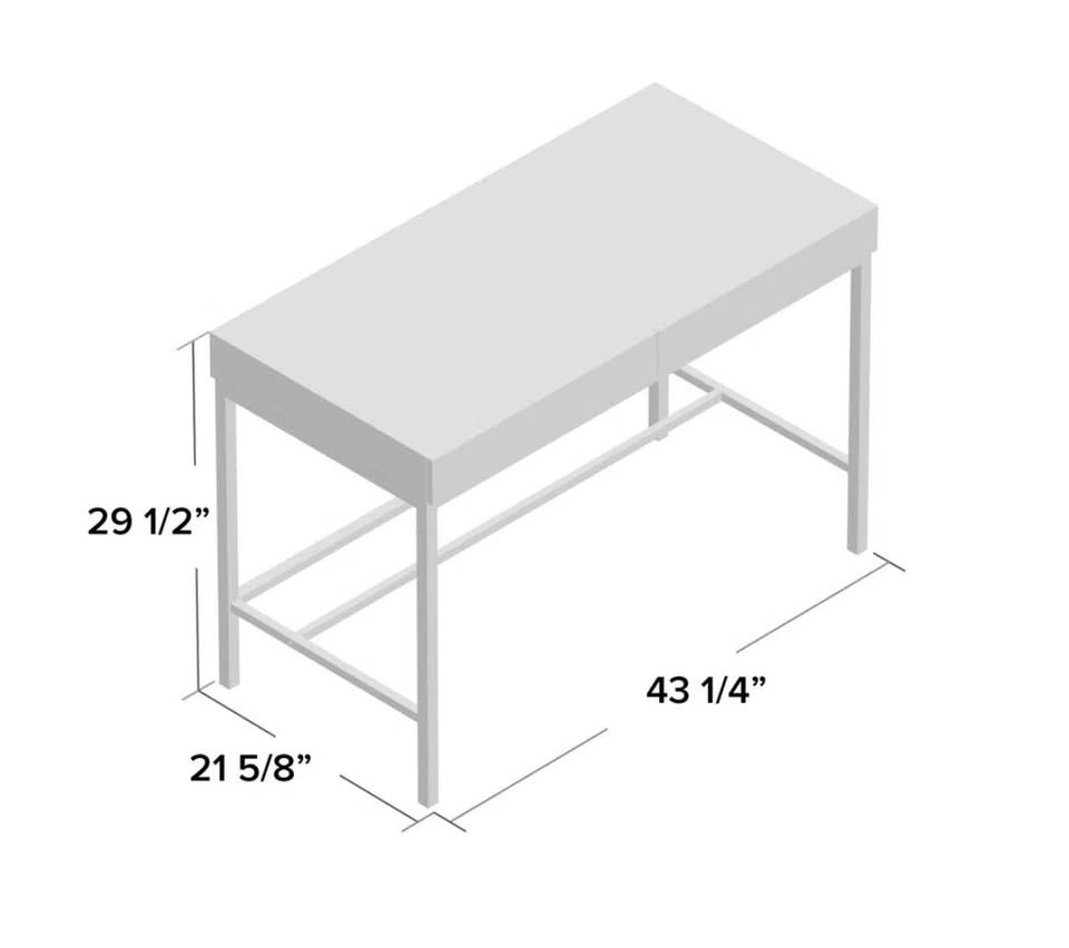 Sturdy wooden desk with black metal frame. Has a two-piece wooden top with a simple black metal frame that provides support. Dimensions: 43.3 inches long, 21.7 inches wide, and 29.5 inches tall.