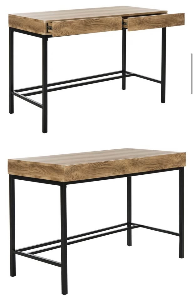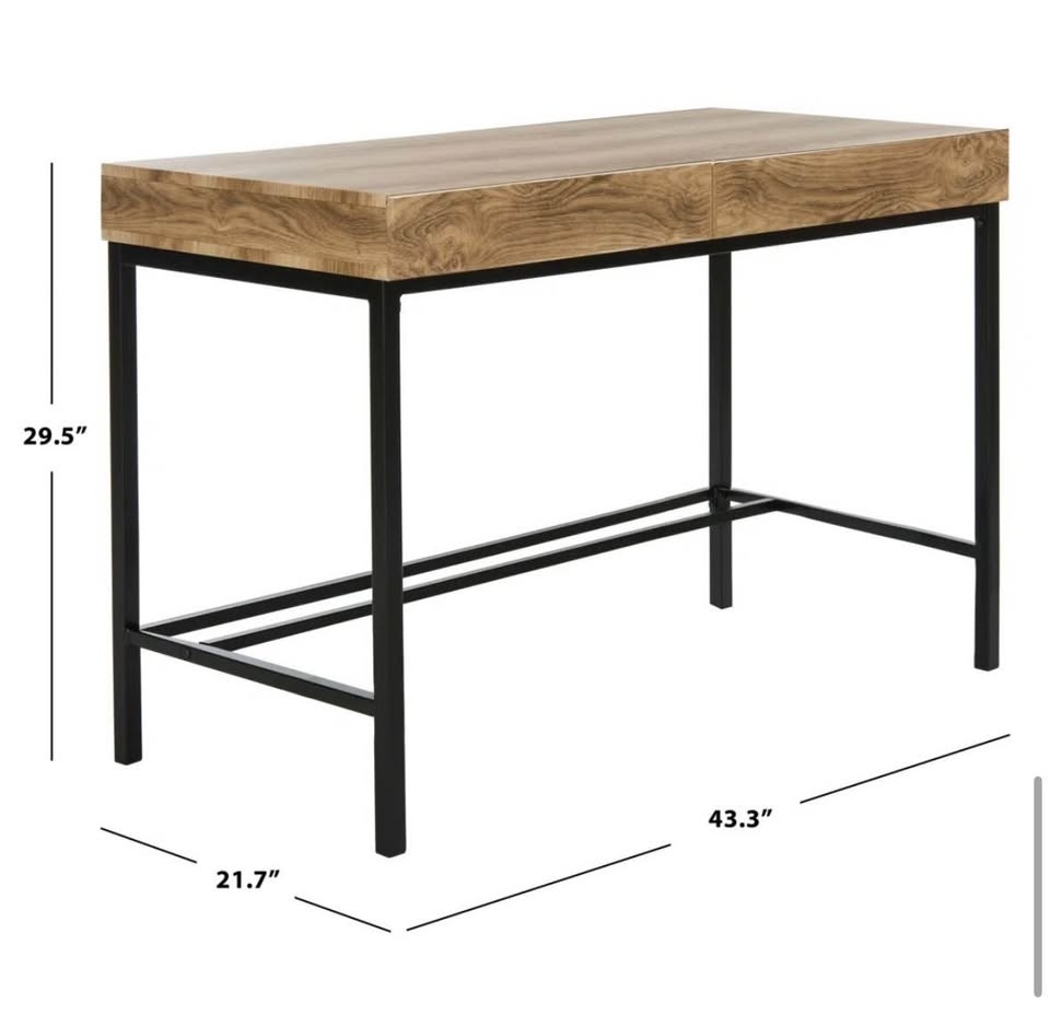 Sturdy wooden desk with black metal frame. Has a two-piece wooden top with a simple black metal frame that provides support. Dimensions: 43.3 inches long, 21.7 inches wide, and 29.5 inches tall.