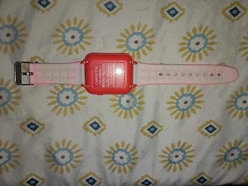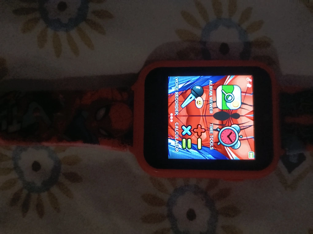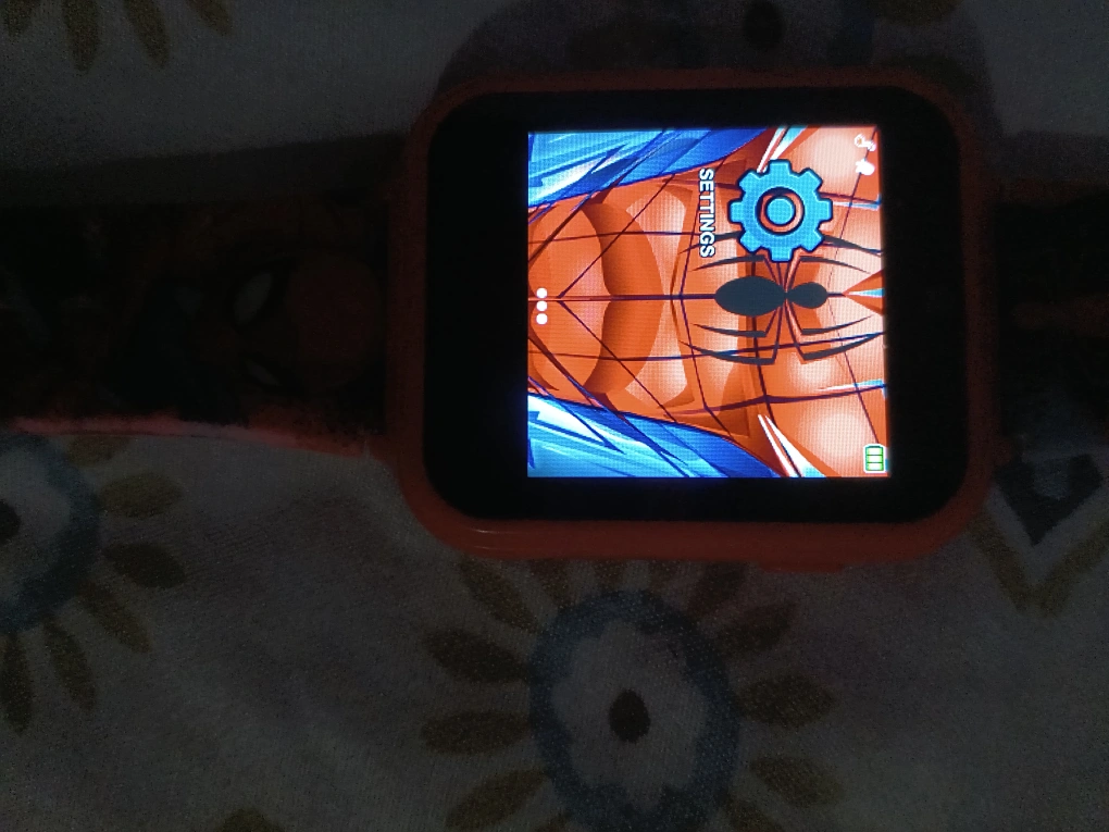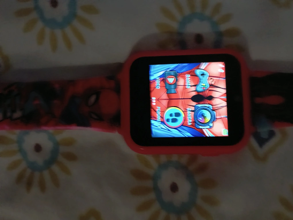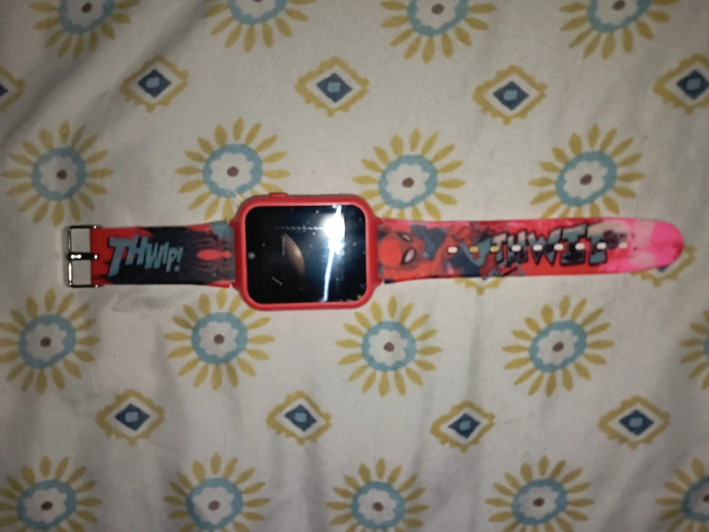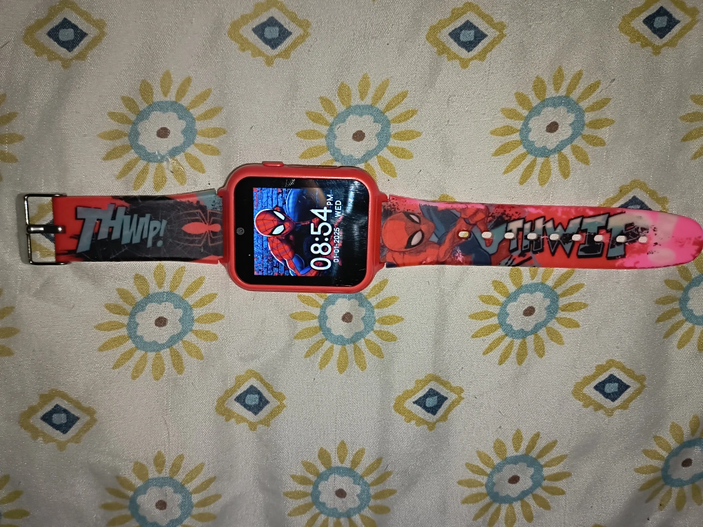 Red Spiderman smartwatch. Features camera, games, and video. Includes a red and pink band. Charging instructions on back.