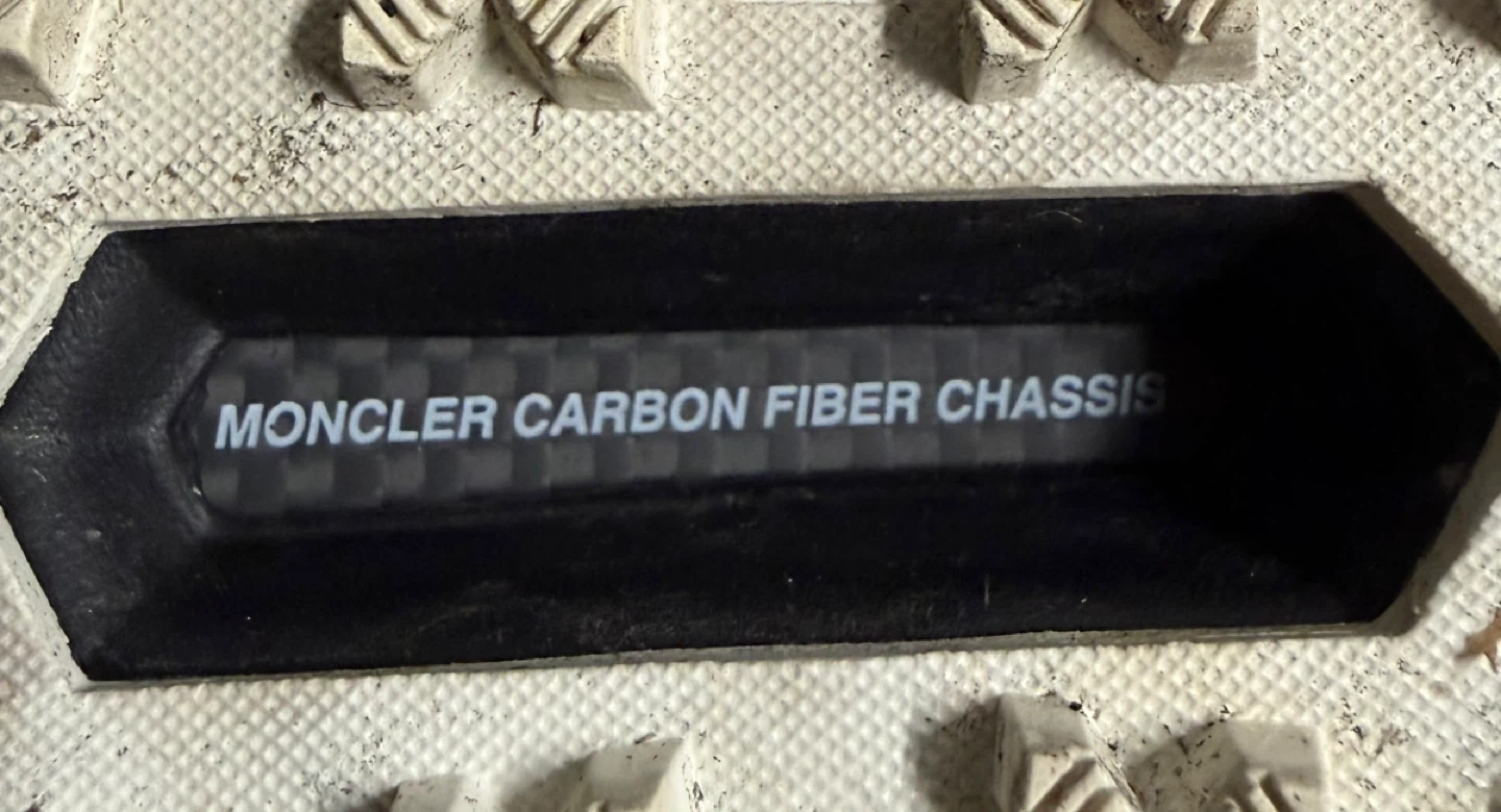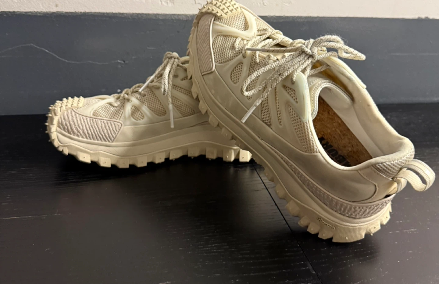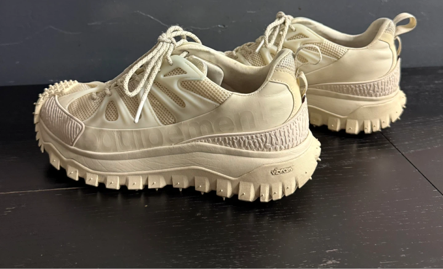 Moncler trail running shoes in a cream white color. Features a "MONCLER CARBON FIBER CHASSIS" and Vibram sole. This shoe's rugged design is built for performance on various terrains.