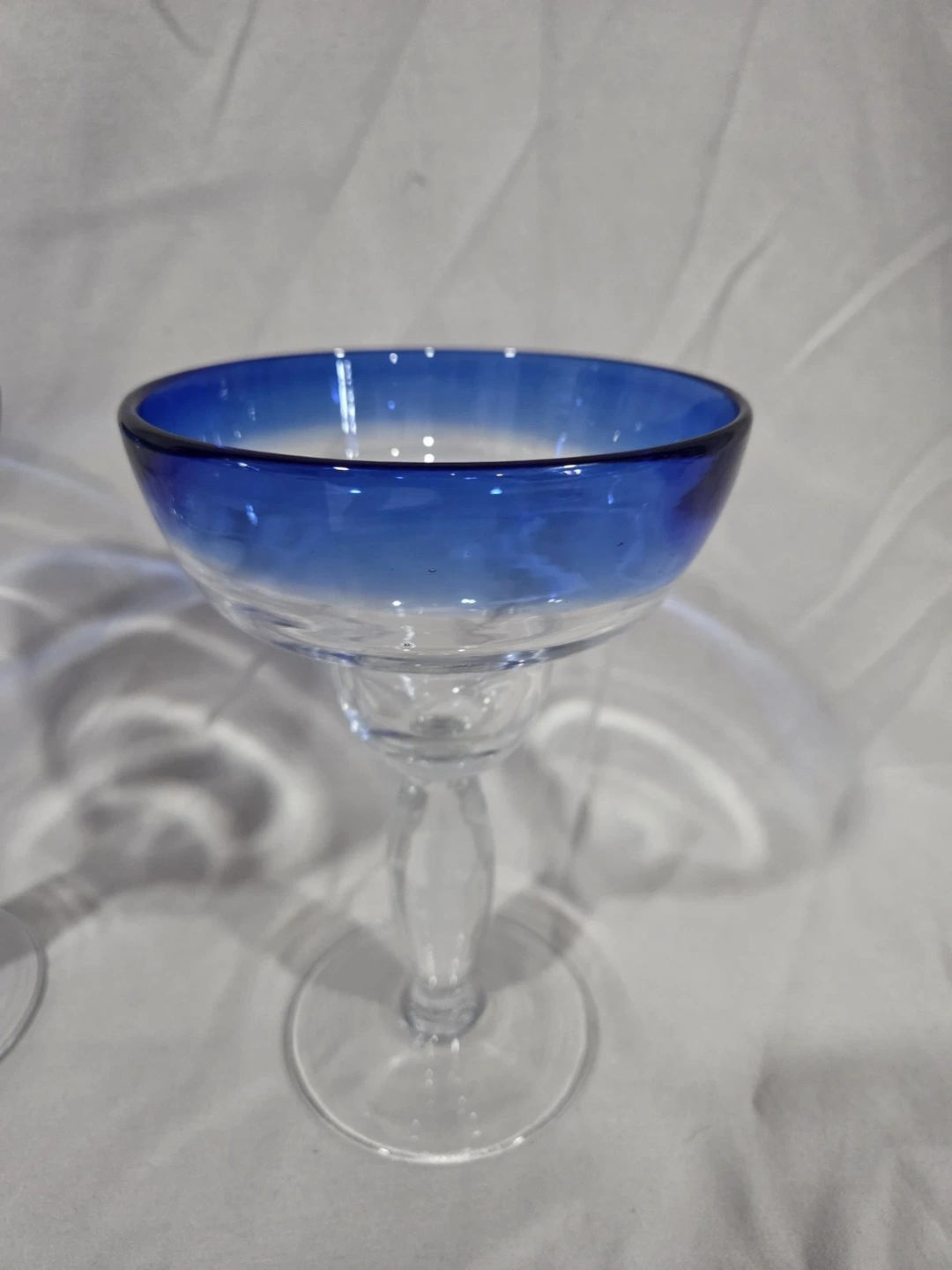 Set of 2 hand-blown cobalt blue rimmed margarita glasses. Perfect for any occasion. Hand wash only. Each glass is 5 inches wide.