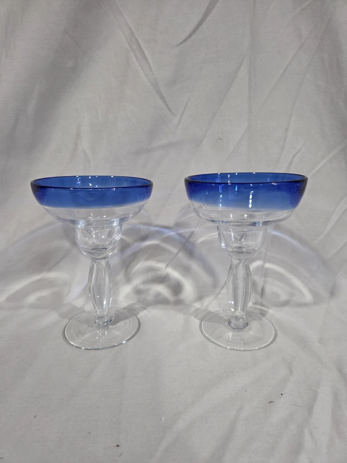 Set of 2 hand-blown cobalt blue rimmed margarita glasses. Perfect for any occasion. Hand wash only. Each glass is 5 inches wide.