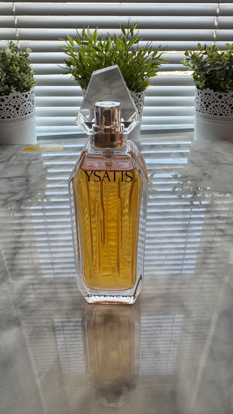 Gold liquid perfume in a clear glass bottle. Faceted design. Box not included.