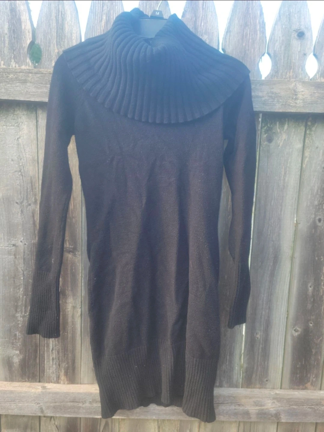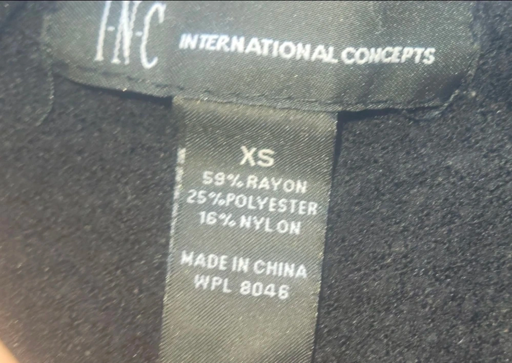 INC International Concepts women's cowl neck sweater dress. It's a size XS and made of 59% rayon, 25% polyester, and 16% nylon. This dress was made in China.