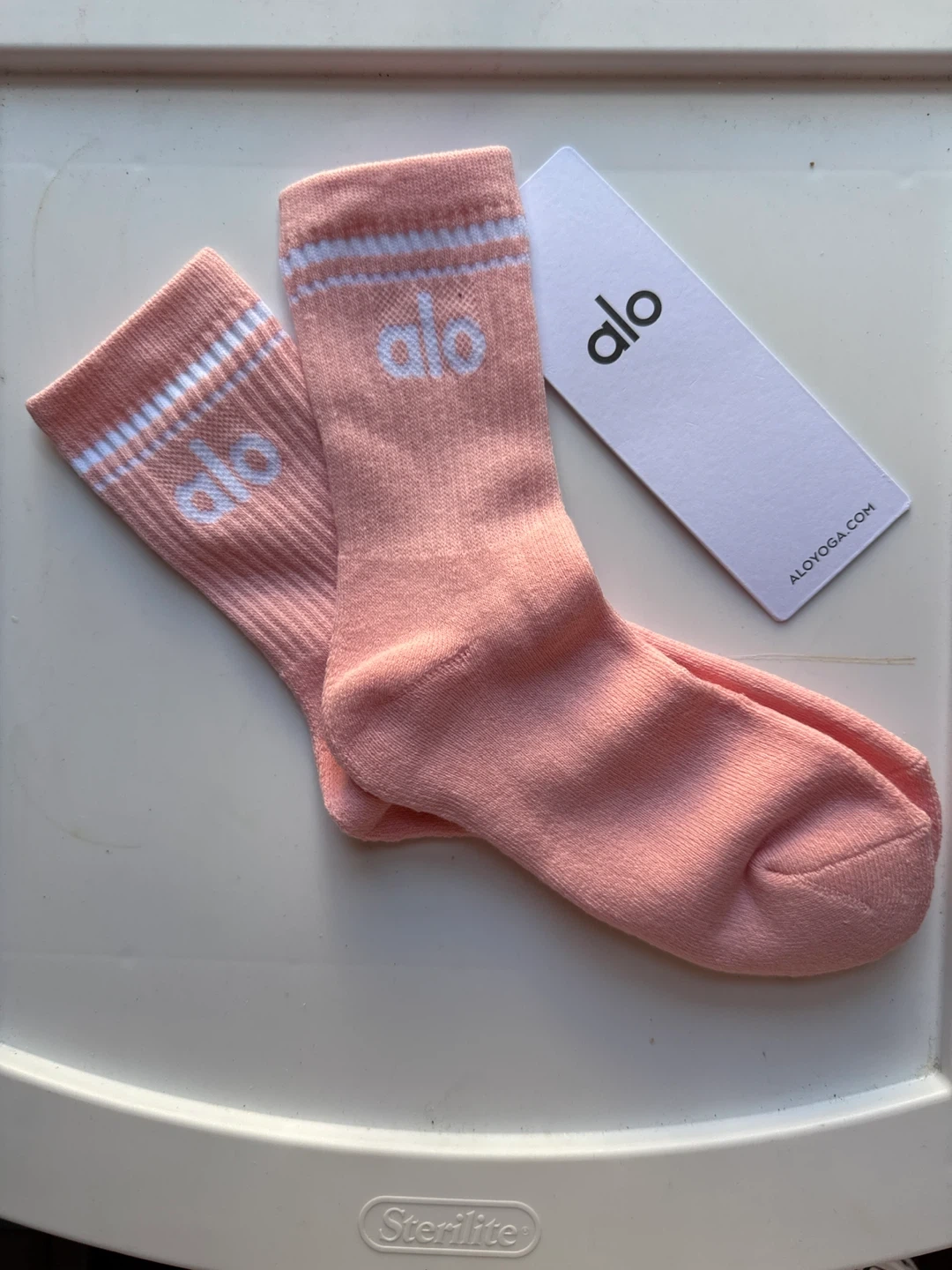 These are Alo Yoga socks in a soft peach color. They feature white stripes at the cuff and the Alo logo. Made for comfort and performance.