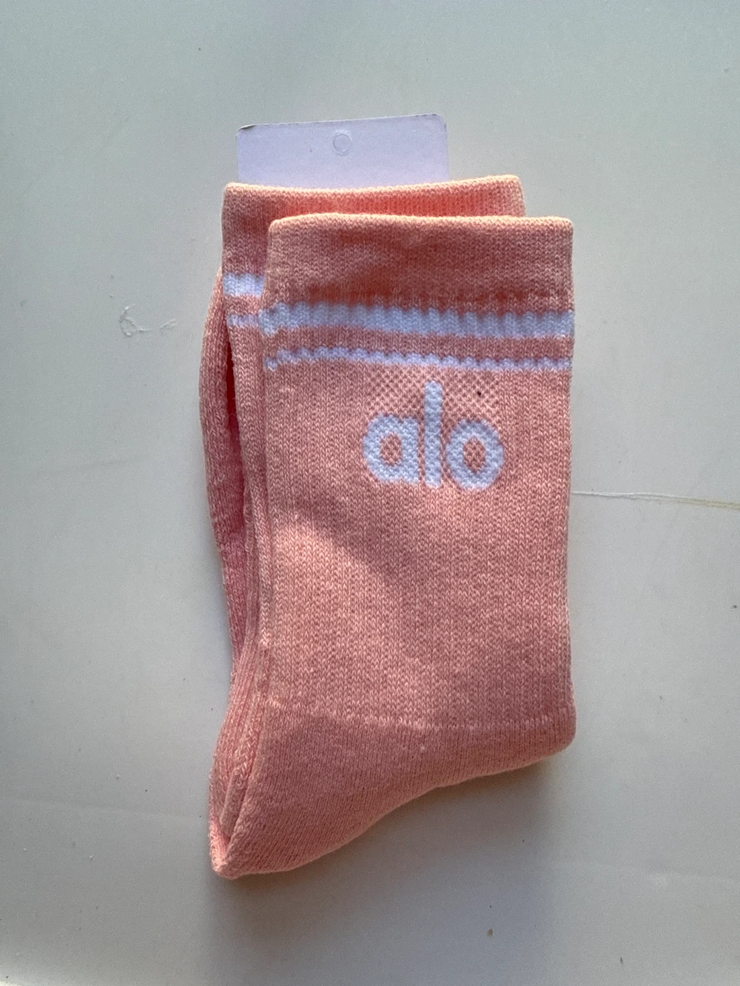 These are Alo Yoga socks in a soft peach color. They feature white stripes at the cuff and the Alo logo. Made for comfort and performance.