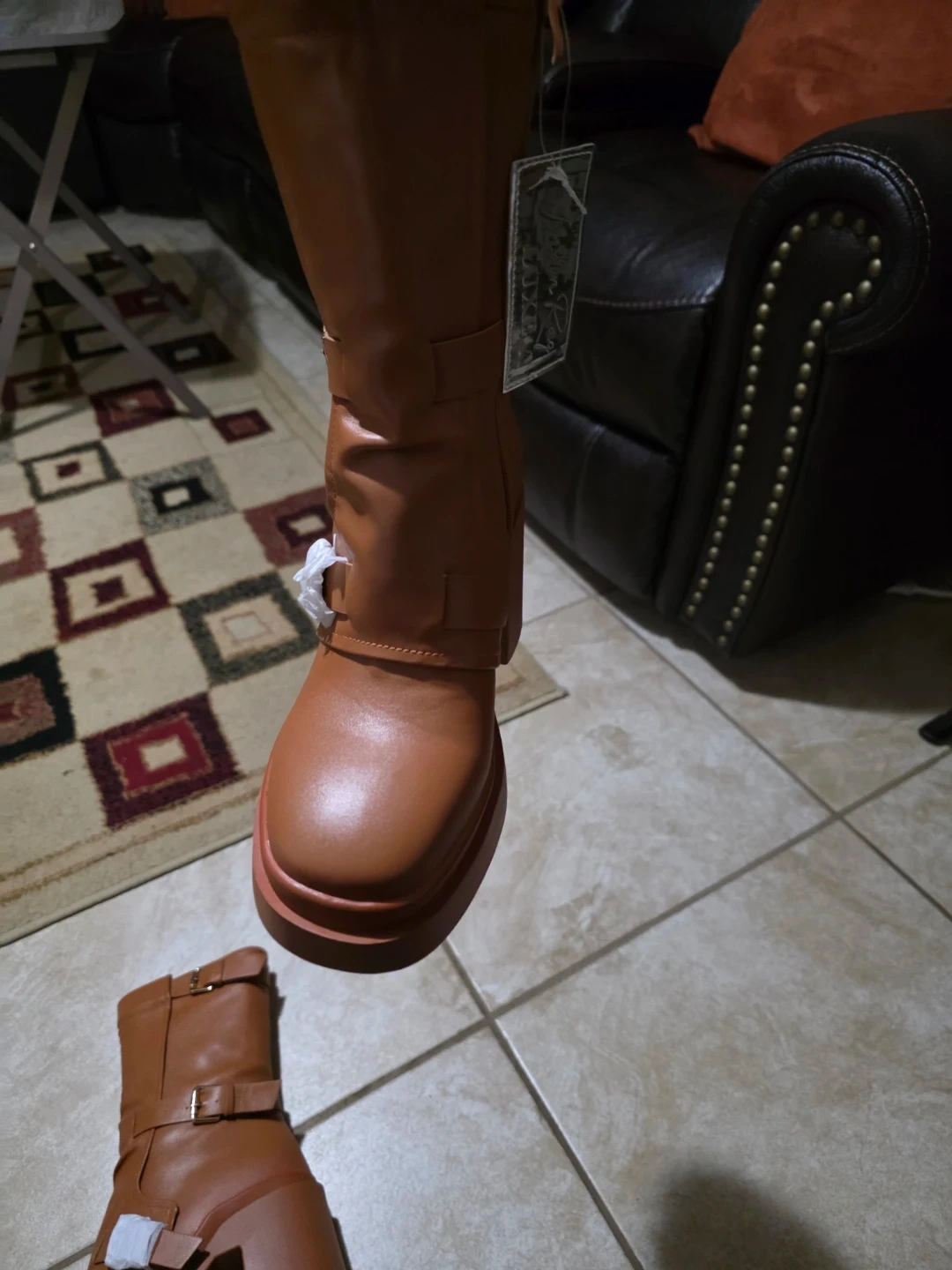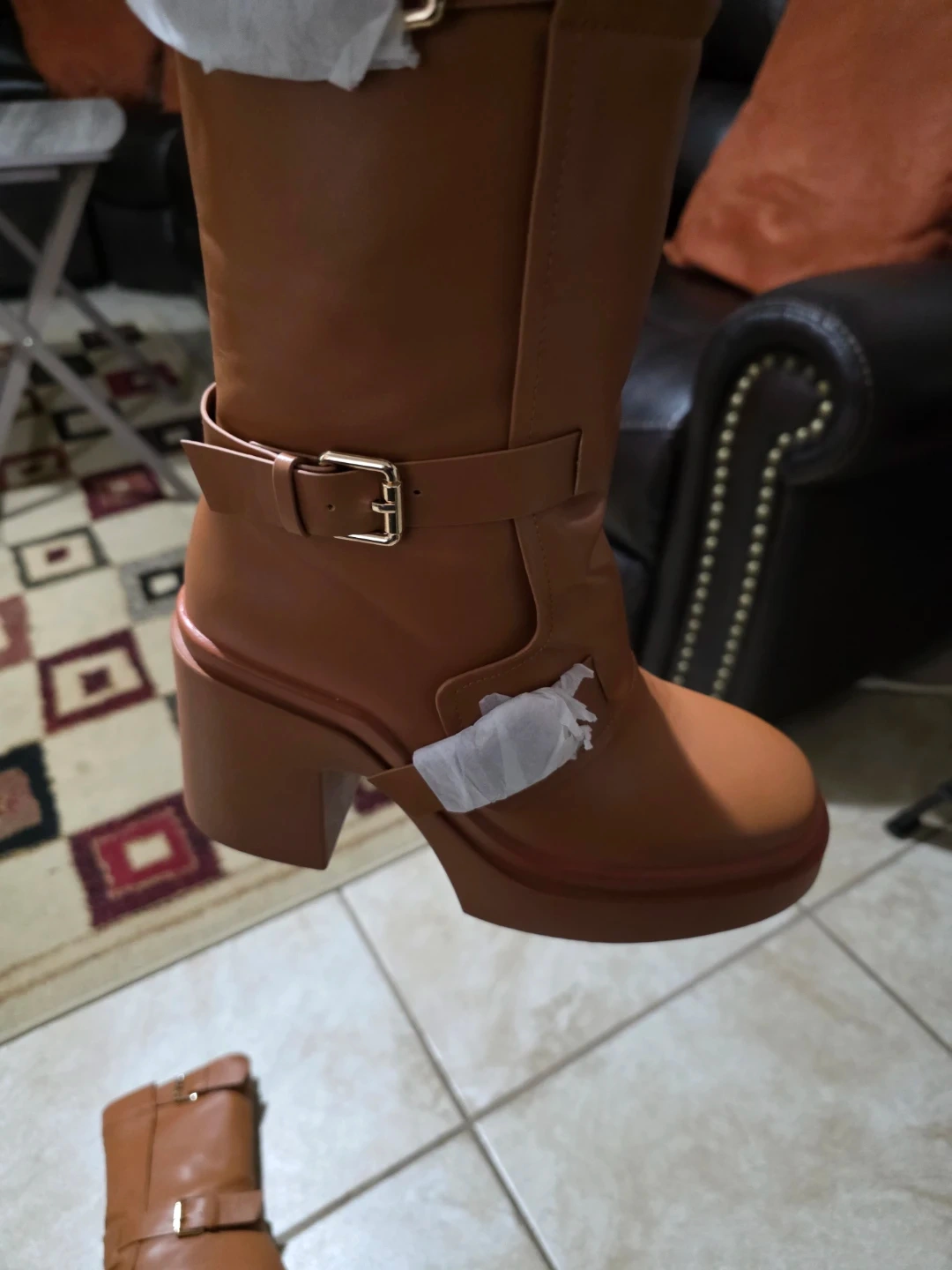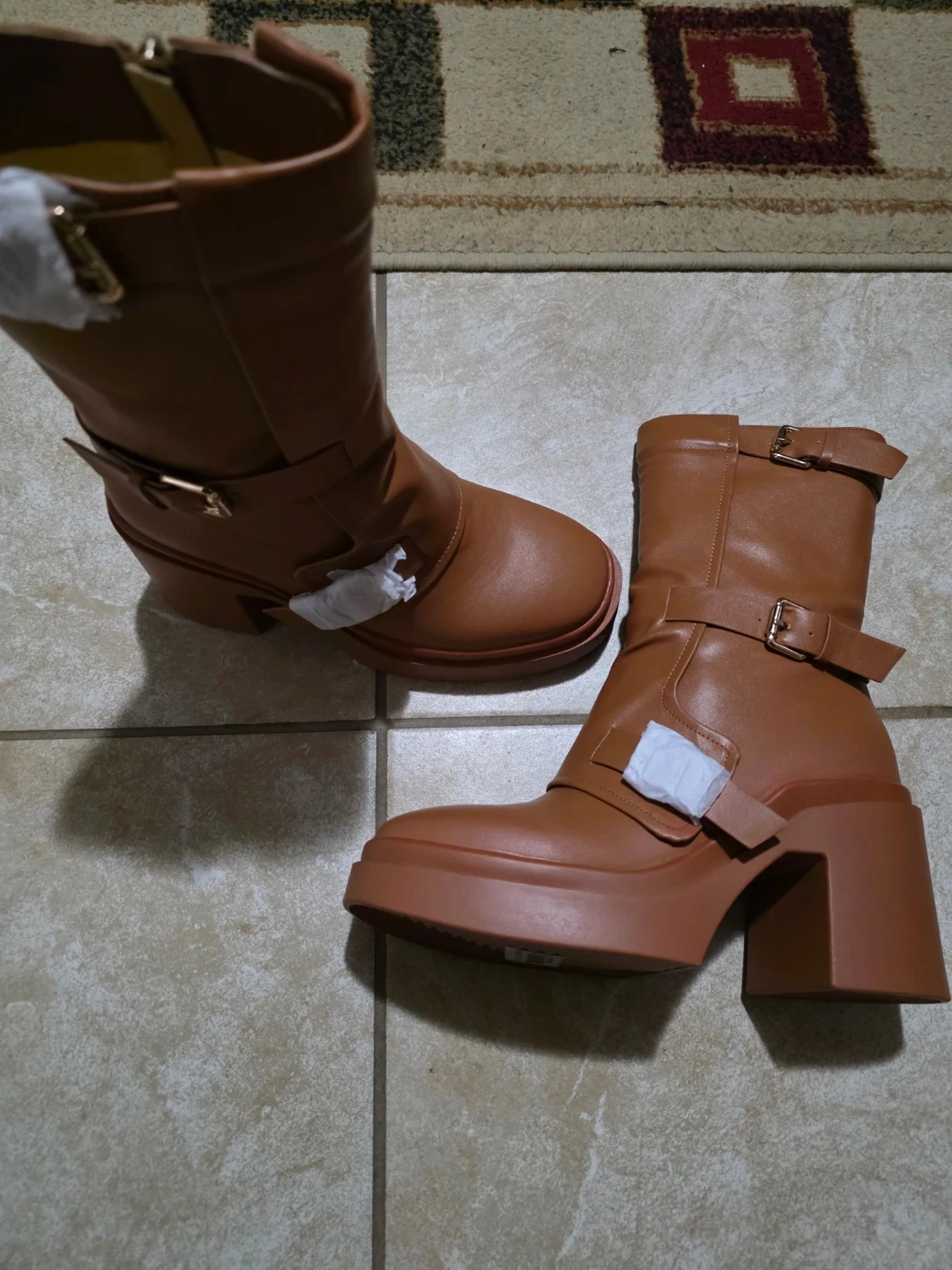 These stylish brown boots feature a chunky platform and heel. They have adjustable buckle straps for a secure fit. Made from faux leather.