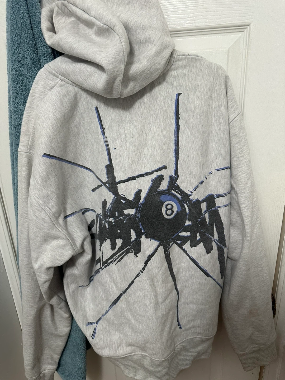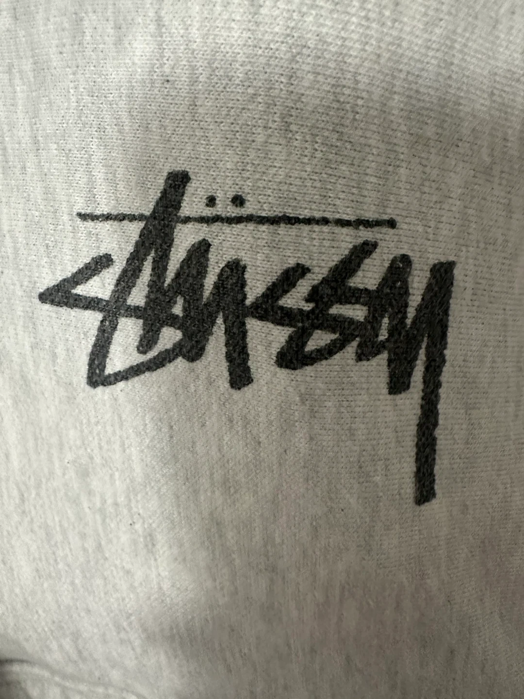 Selling a Stussy full zip hoodie in size large! It's a light grey color and has the classic Stussy logo on the front. There's also a cool design on the back. Perfect for layering or wearing on its own