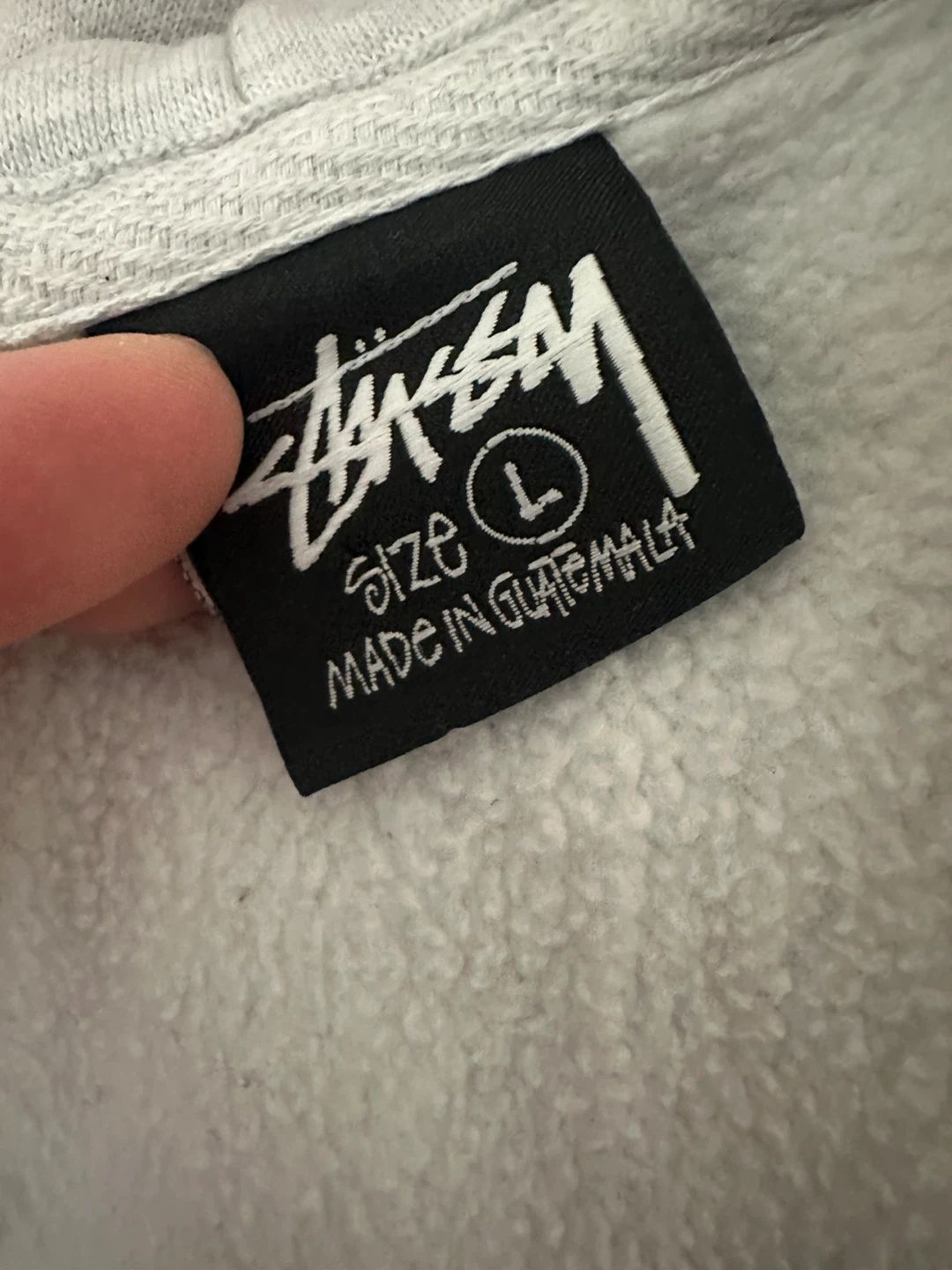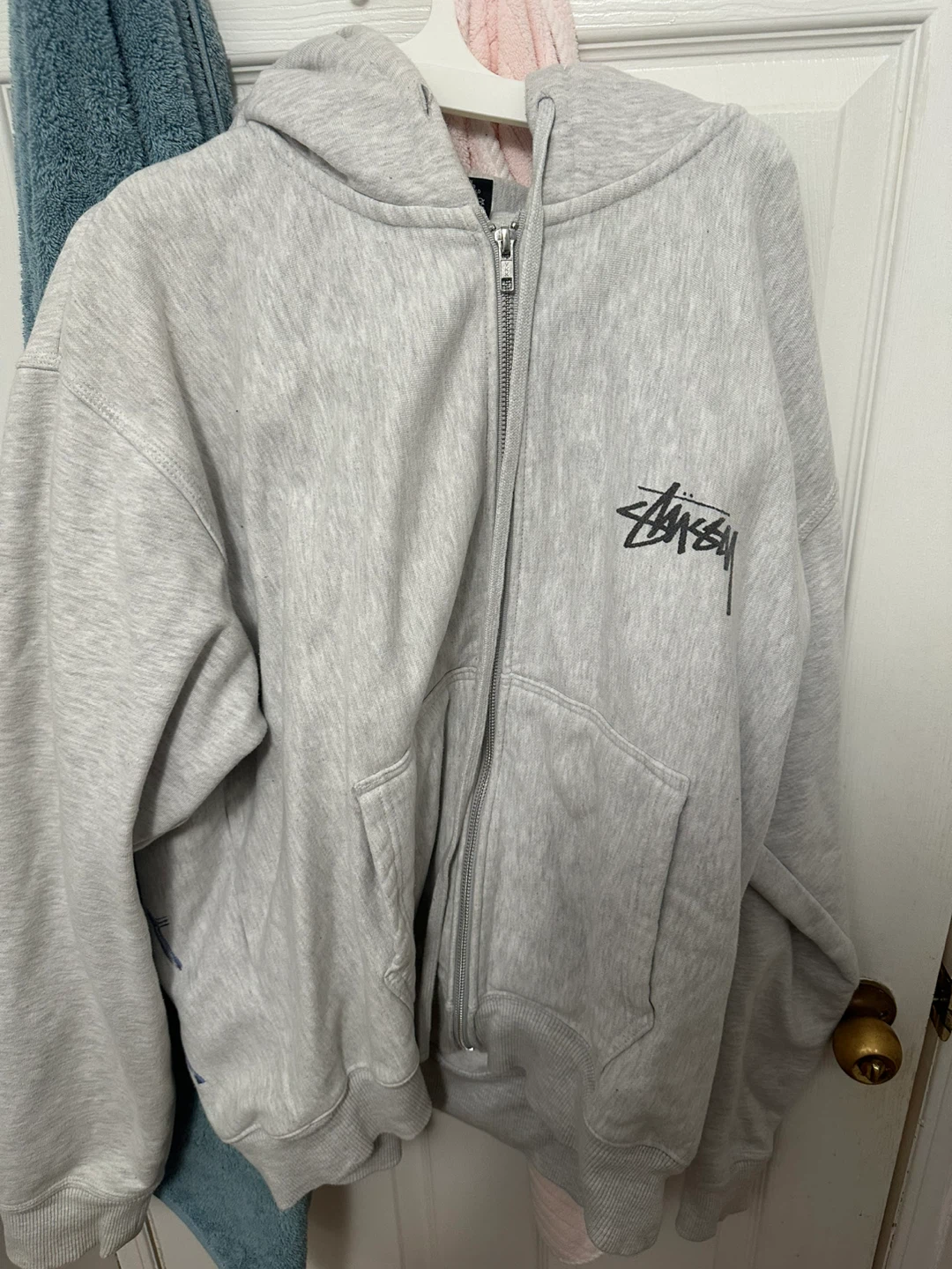 Selling a Stussy full zip hoodie in size large! It's a light grey color and has the classic Stussy logo on the front. There's also a cool design on the back. Perfect for layering or wearing on its own