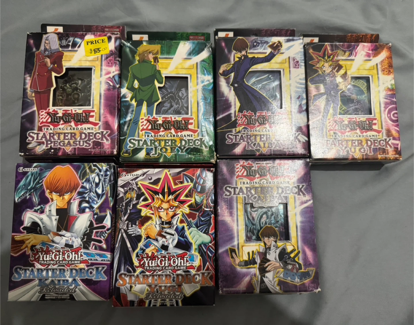 60Selling a Yu-Gi-Oh! Blue-Eyes White Dragon card, along with several starter decks. The starter decks include Pegasus, Joey, Kaiba, and Yugi. Great for collectors or players looking to expand their collection