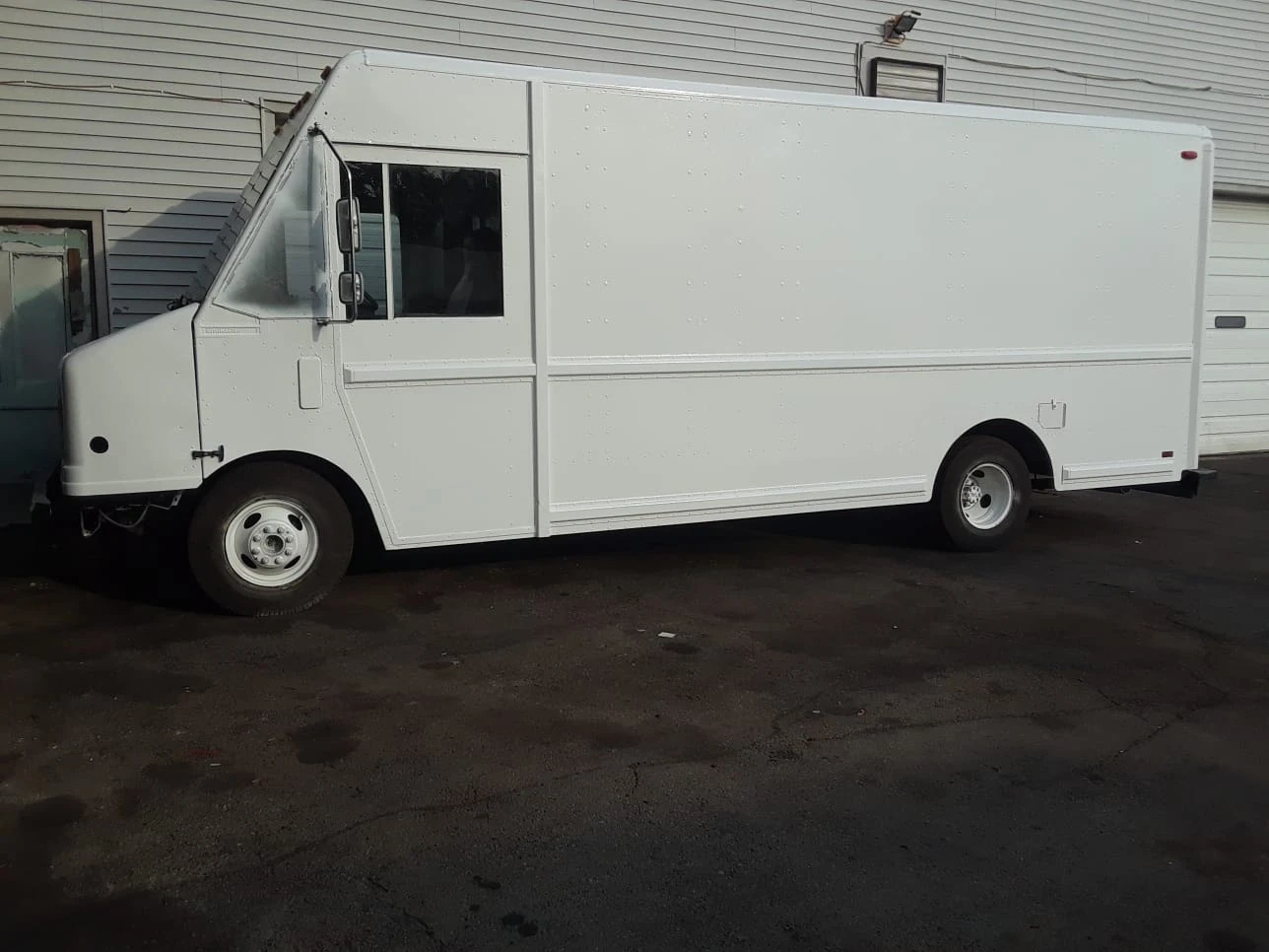 This is a white delivery truck. It features a large cargo area for hauling goods. Rear barn doors provide easy access to the cargo space.