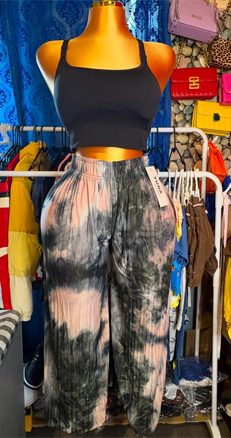 These pants are from YUNA Fashion and feature a unique tie-dye pattern in shades of gray and pink. They appear to be a comfortable, flowy style, perfect for casual wear