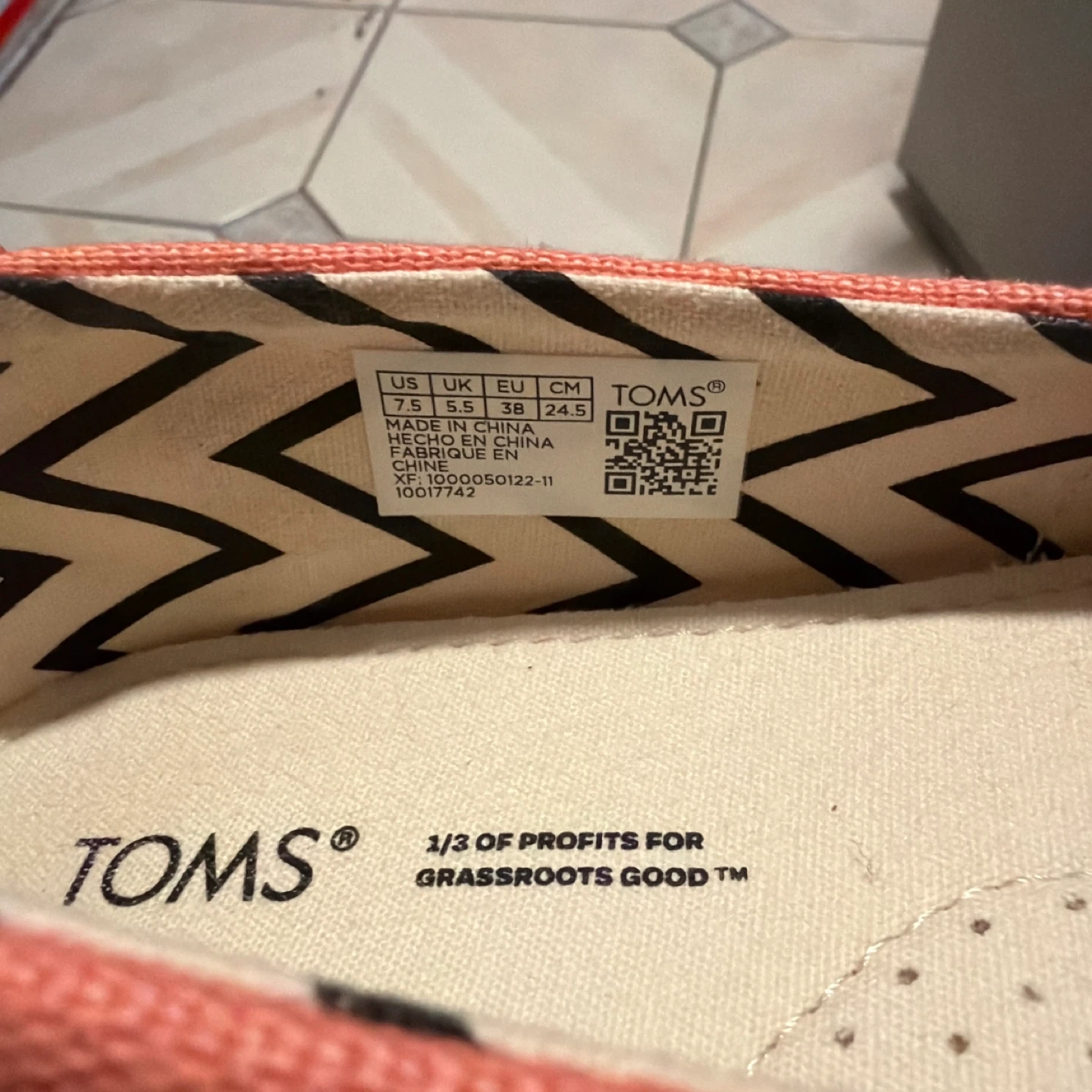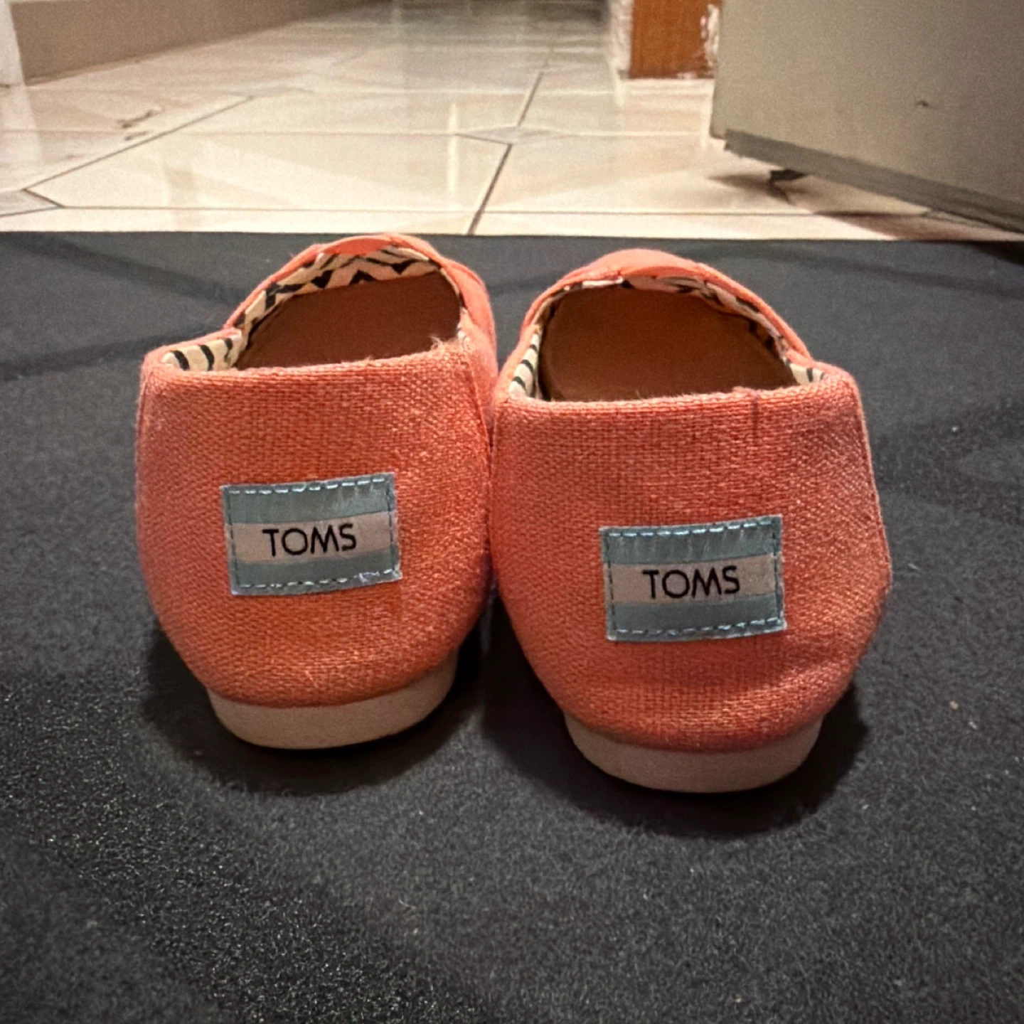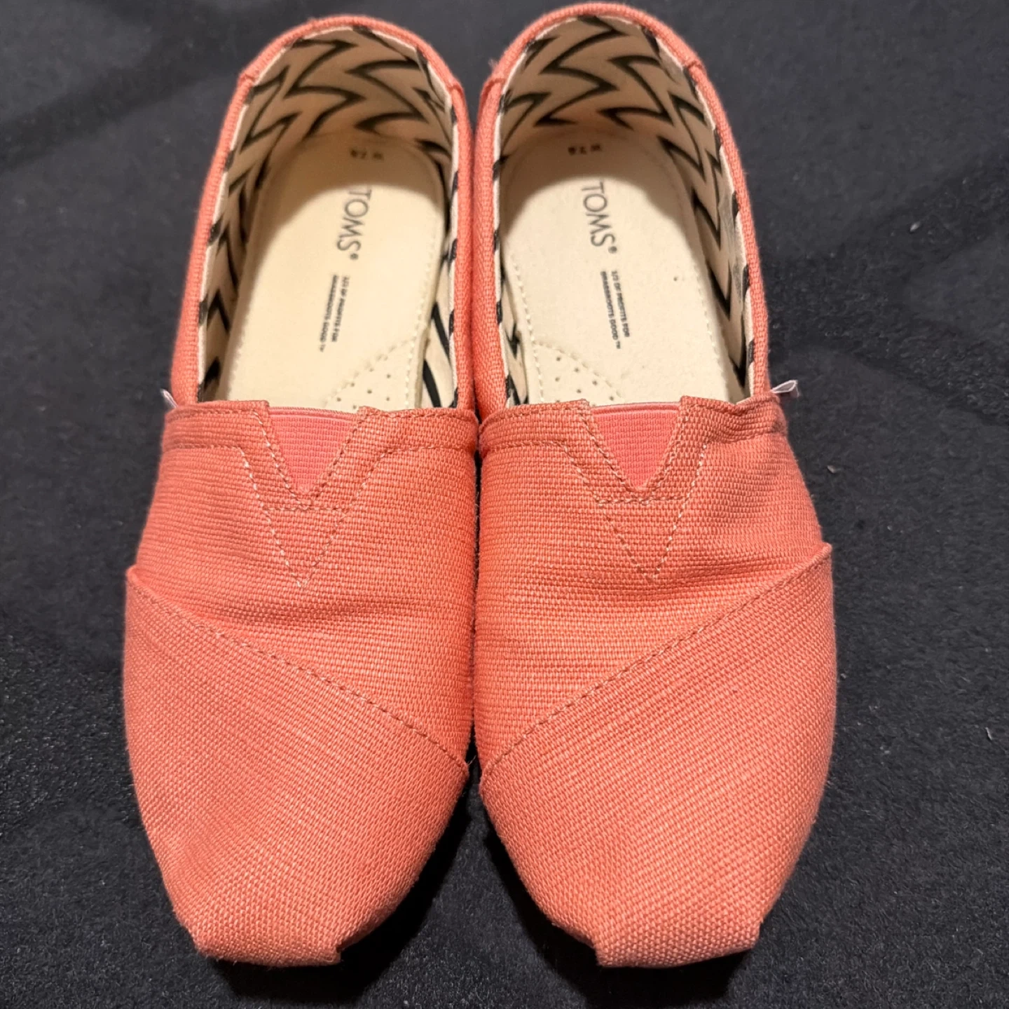 Coral canvas slip-on flats from TOMS. Women's size 7.5 (US) / 38 (EU) / 24.5 (CM). These shoes are made with a comfortable canvas material and feature the brand's signature zigzag lining. They're lightweight and perfect for everyday wear!