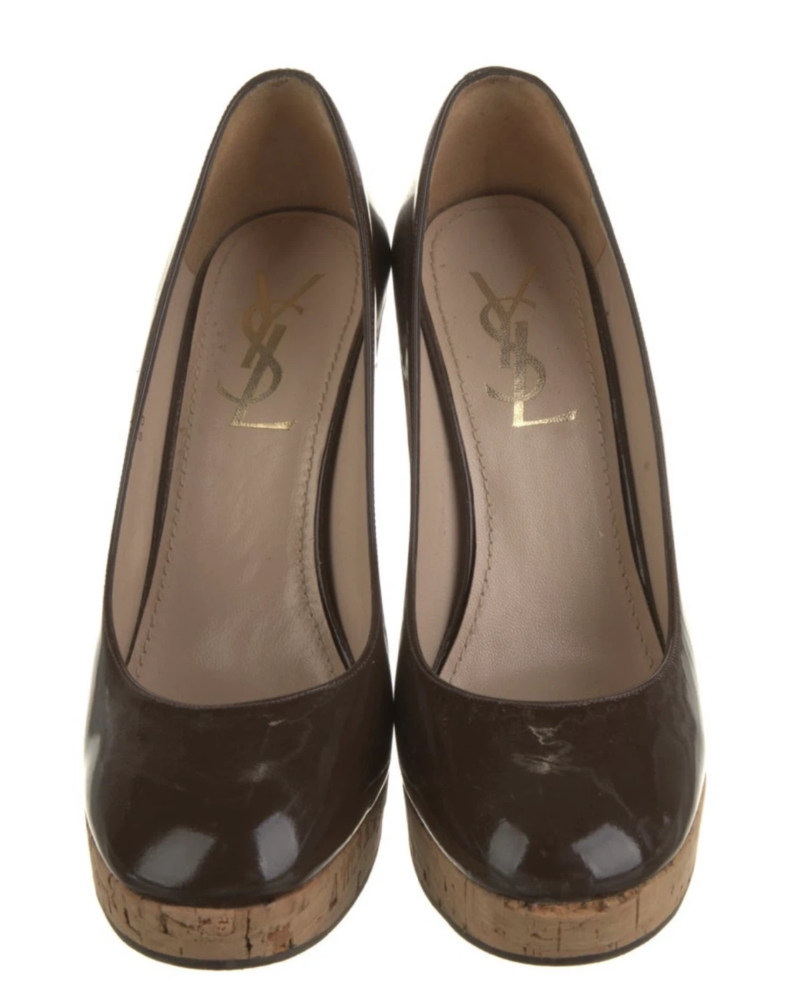 These are a pair of Yves Saint Laurent wedge heels. They feature a brown patent leather upper and a cork wedge heel. The YSL logo is displayed on the insole. They are in good condition and ready for a new home!