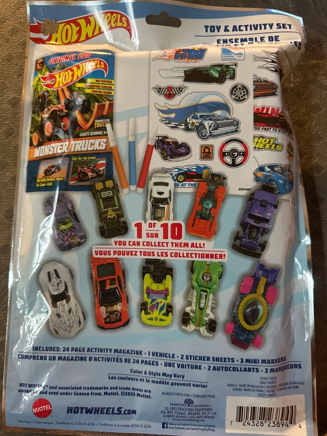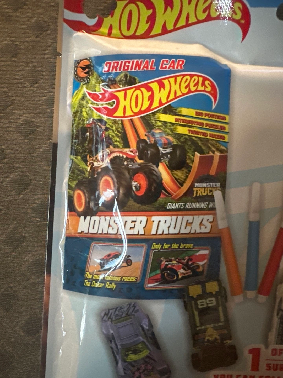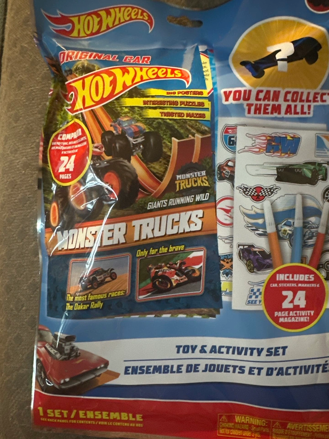 Brand new Hot Wheels Monster Trucks toy and activity set! Includes a 24-page activity magazine, 1 vehicle, 2 sticker sheets, and 3 mini markers. Perfect for any Hot Wheels fan!