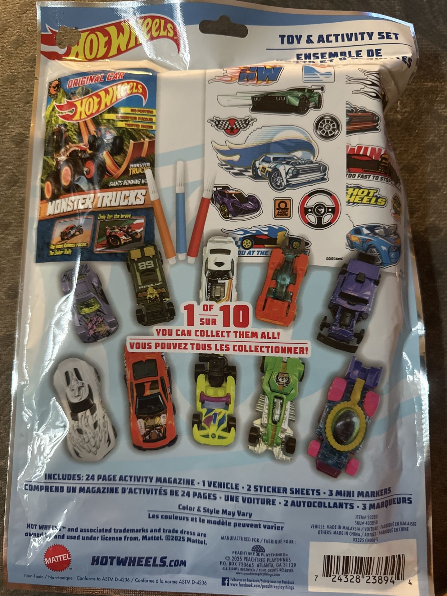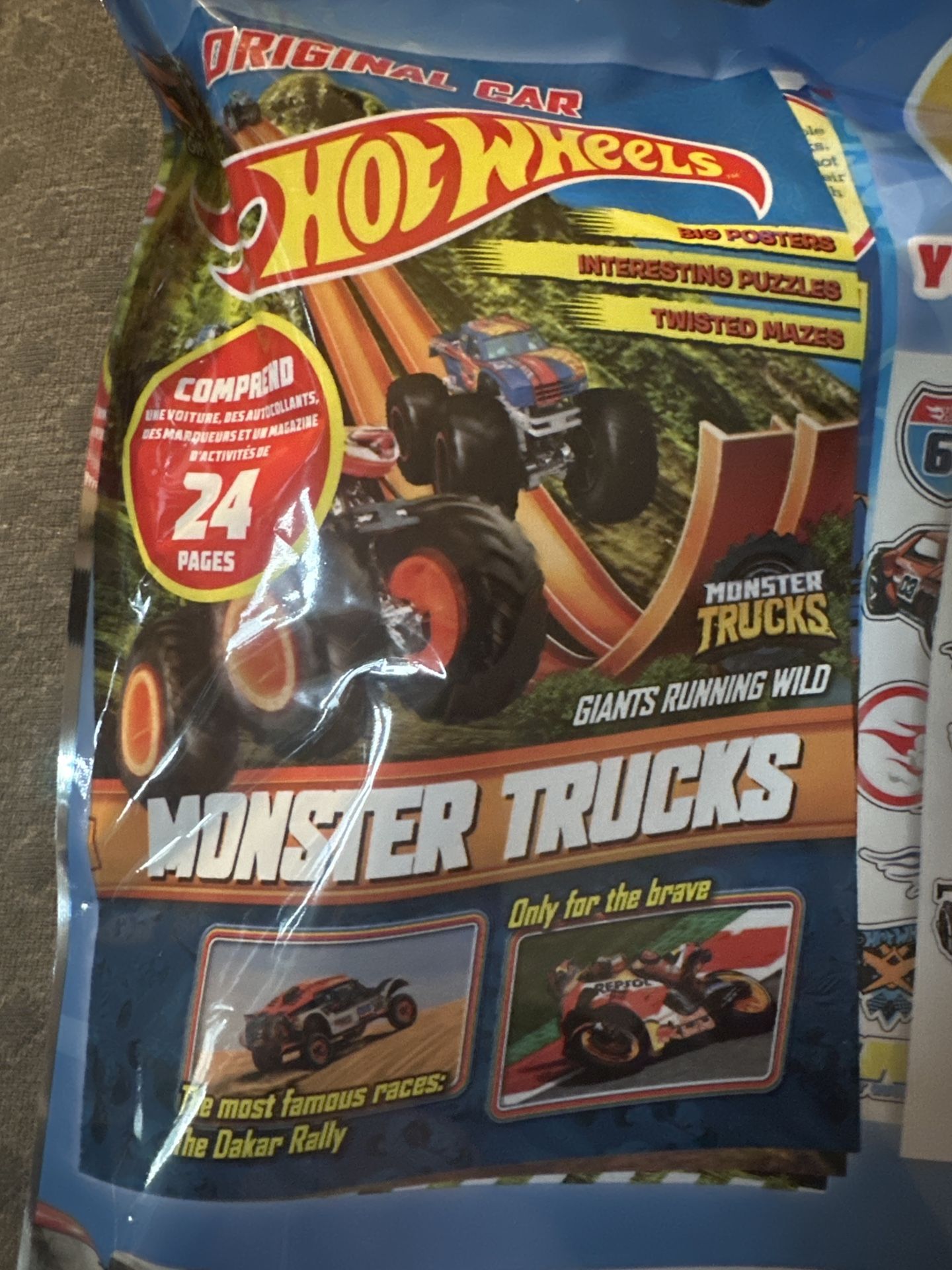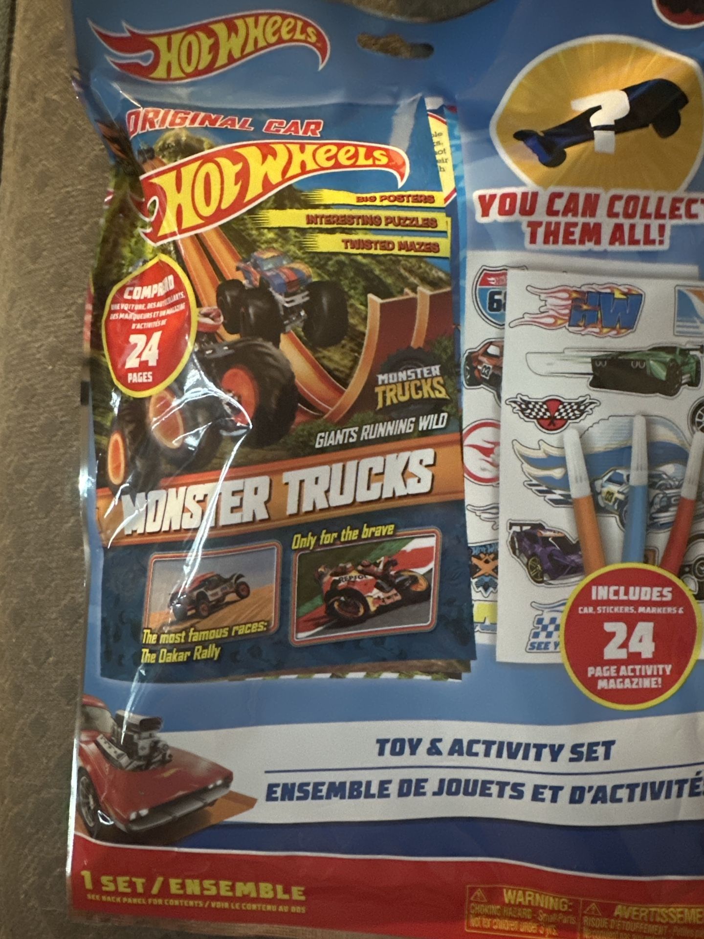 Brand new Hot Wheels Monster Trucks toy and activity set! Includes a 24-page activity magazine, 1 vehicle, 2 sticker sheets, and 3 mini markers. Perfect for any Hot Wheels fan!