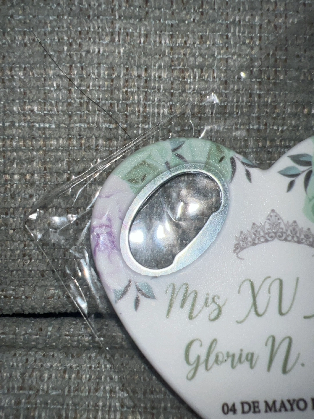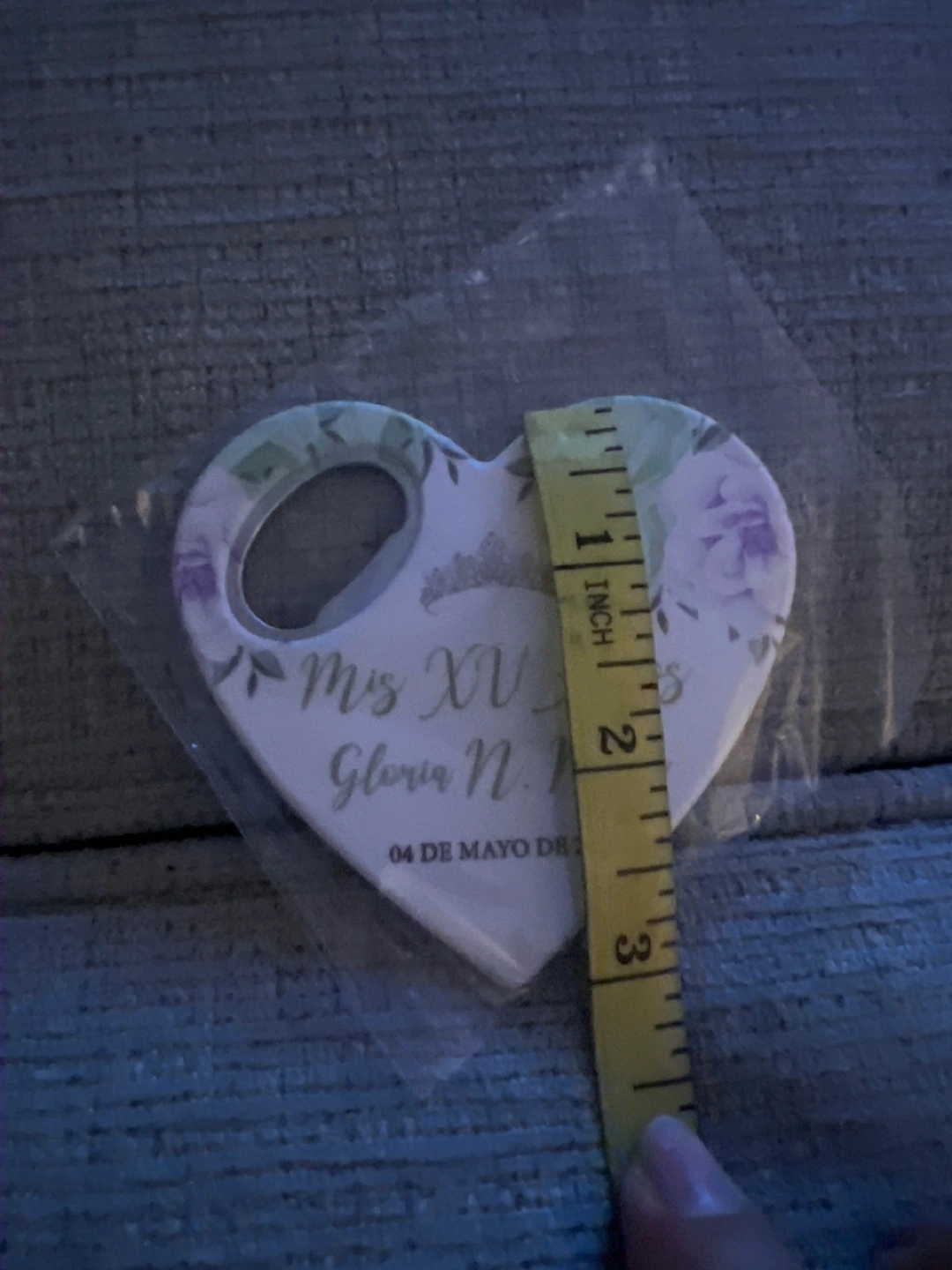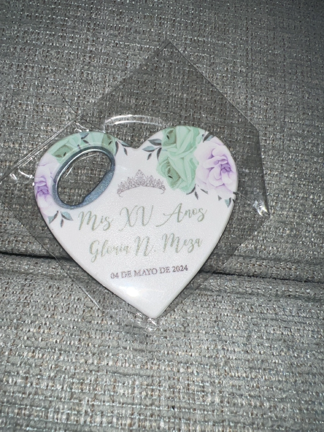 Personalized bottle opener. Heart-shaped design. Floral pattern. Metal bottle opener. Personalized with name and date. Quinceañera theme. New condition.